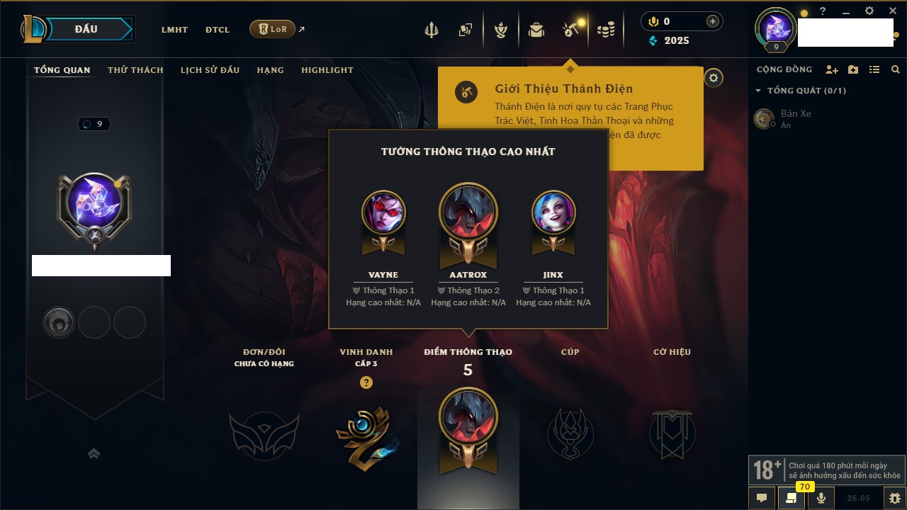 Rank Đơn: Chưa rank mùa nàoKhung: Chưa có khungTướng: 14 - Còn 2855 THXTrang Phục: 1Rank ĐTCL: Chưa RankLinh Thú: 9