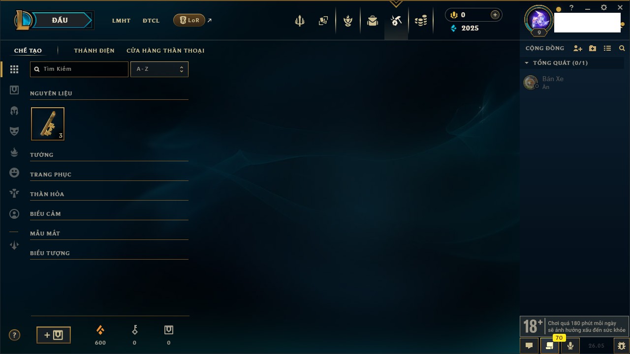 Rank Đơn: Chưa rank mùa nàoKhung: Chưa có khungTướng: 12 - Còn 2610 THXTrang Phục: 1Rank ĐTCL: Chưa RankLinh Thú: 5