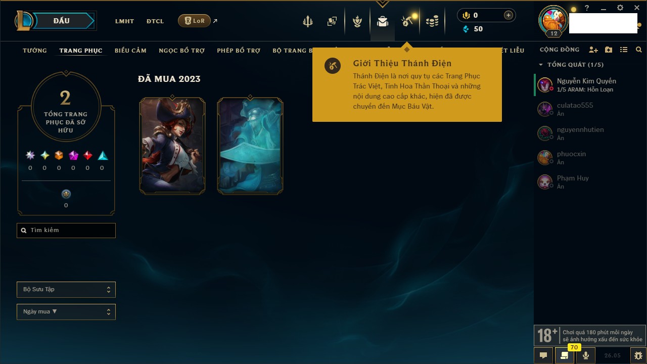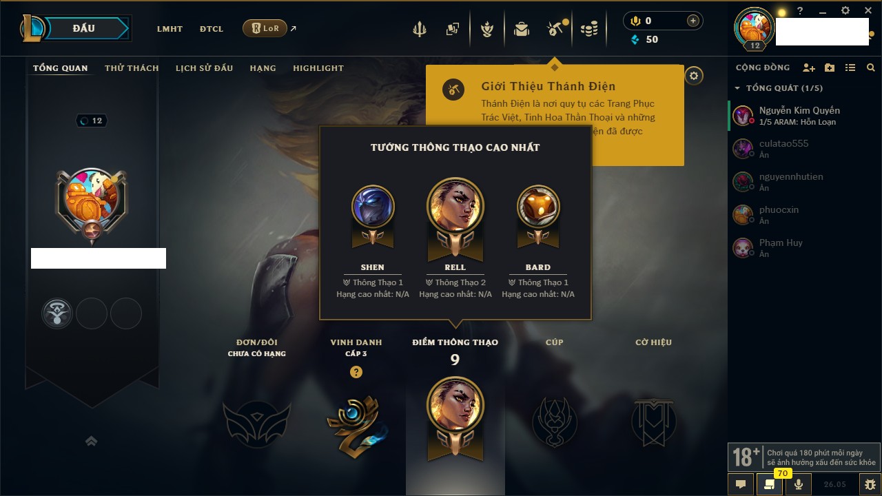 Rank Đơn: Chưa rank mùa nàoKhung: Chưa có khungTướng: 12 - Còn 2610 THXTrang Phục: 1Rank ĐTCL: Chưa RankLinh Thú: 5