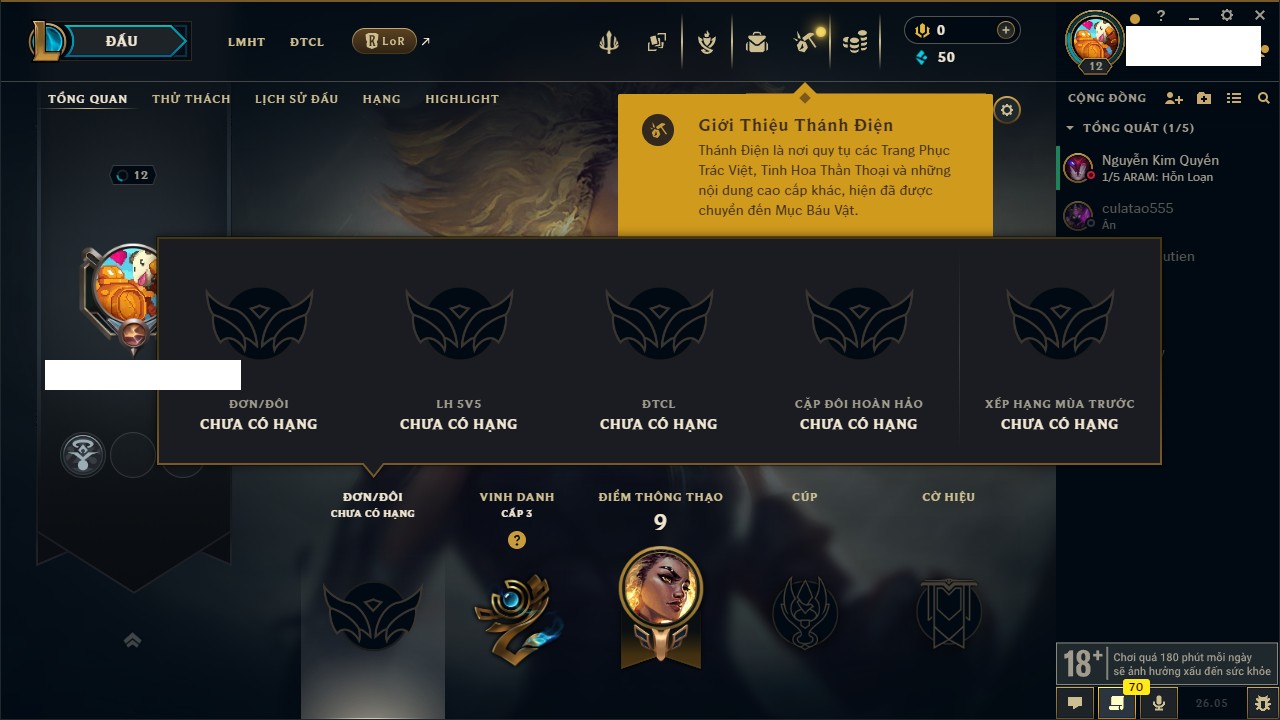 Rank Đơn: Chưa rank mùa nàoKhung: Chưa có khungTướng: 14 - Còn 2855 THXTrang Phục: 1Rank ĐTCL: Chưa RankLinh Thú: 9