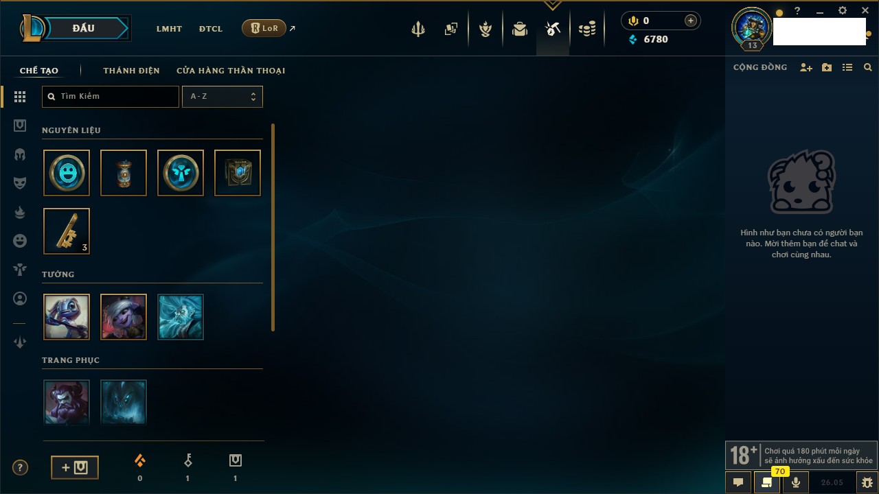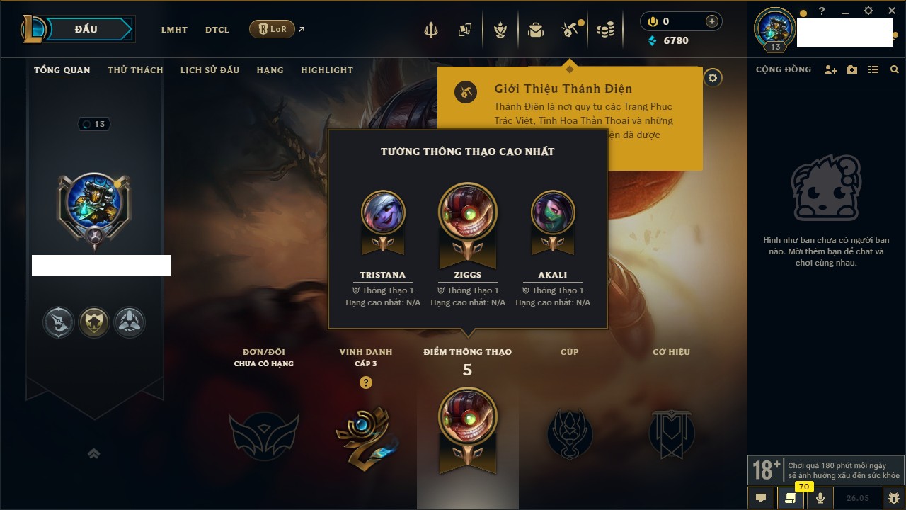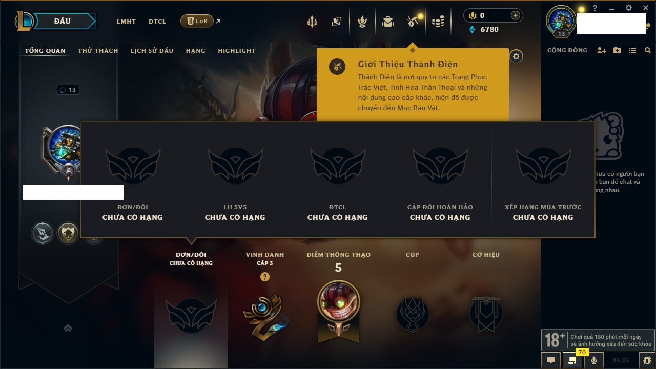 Rank Đơn: Chưa rank mùa nàoKhung: Chưa có khungTướng: 7 - Còn 4799 THXTrang Phục: 4Rank ĐTCL: Chưa RankLinh Thú: 24