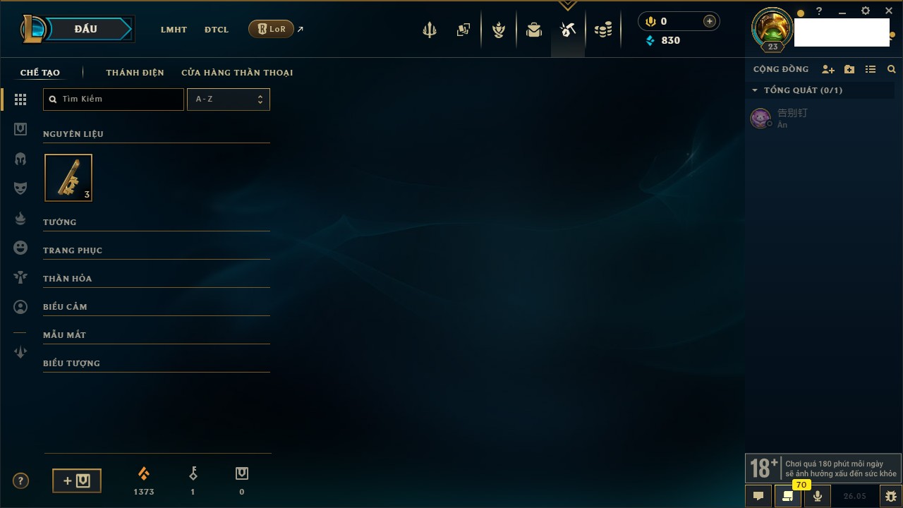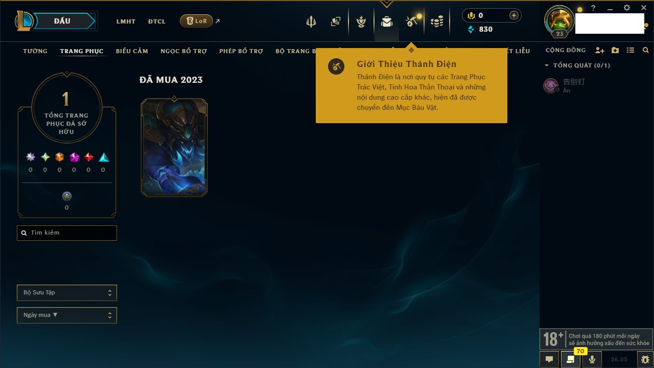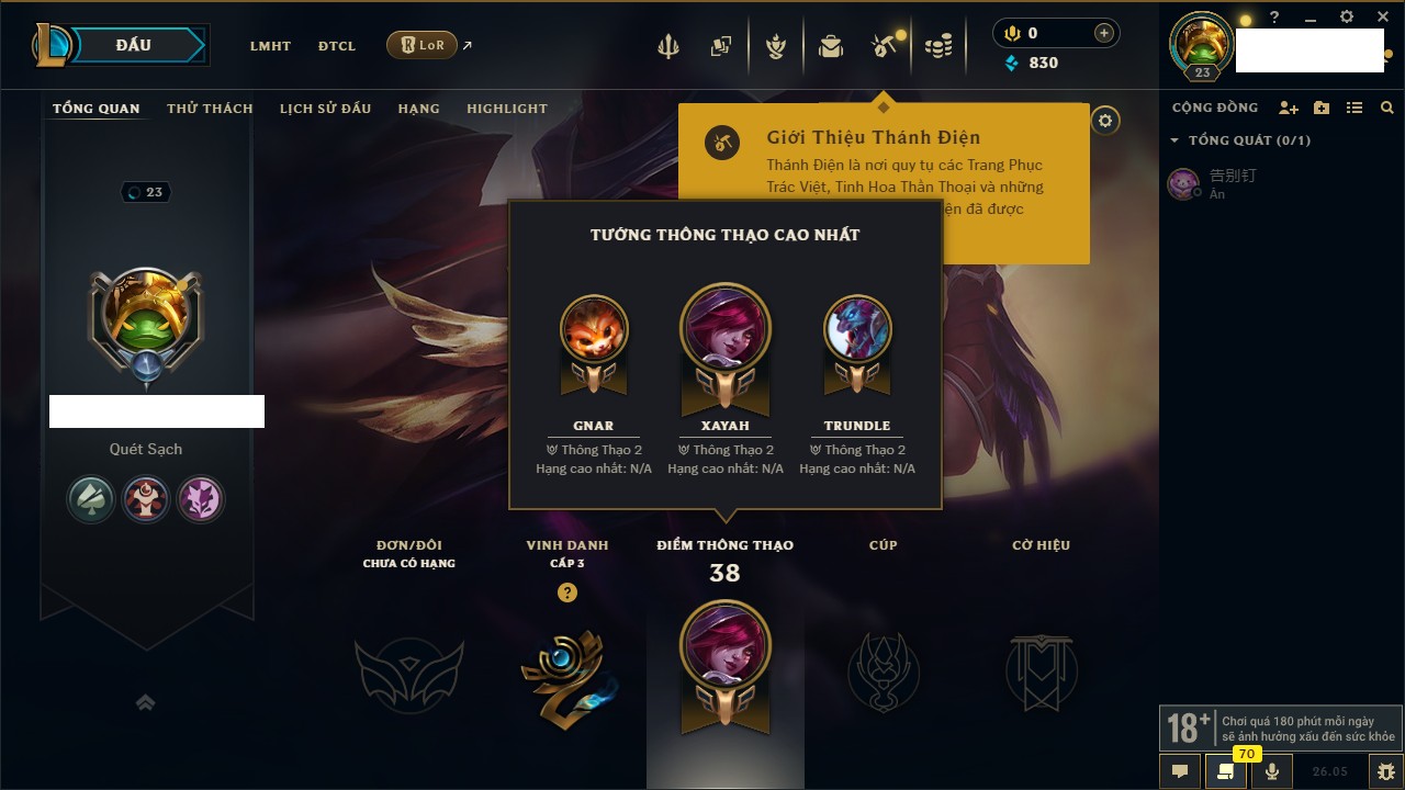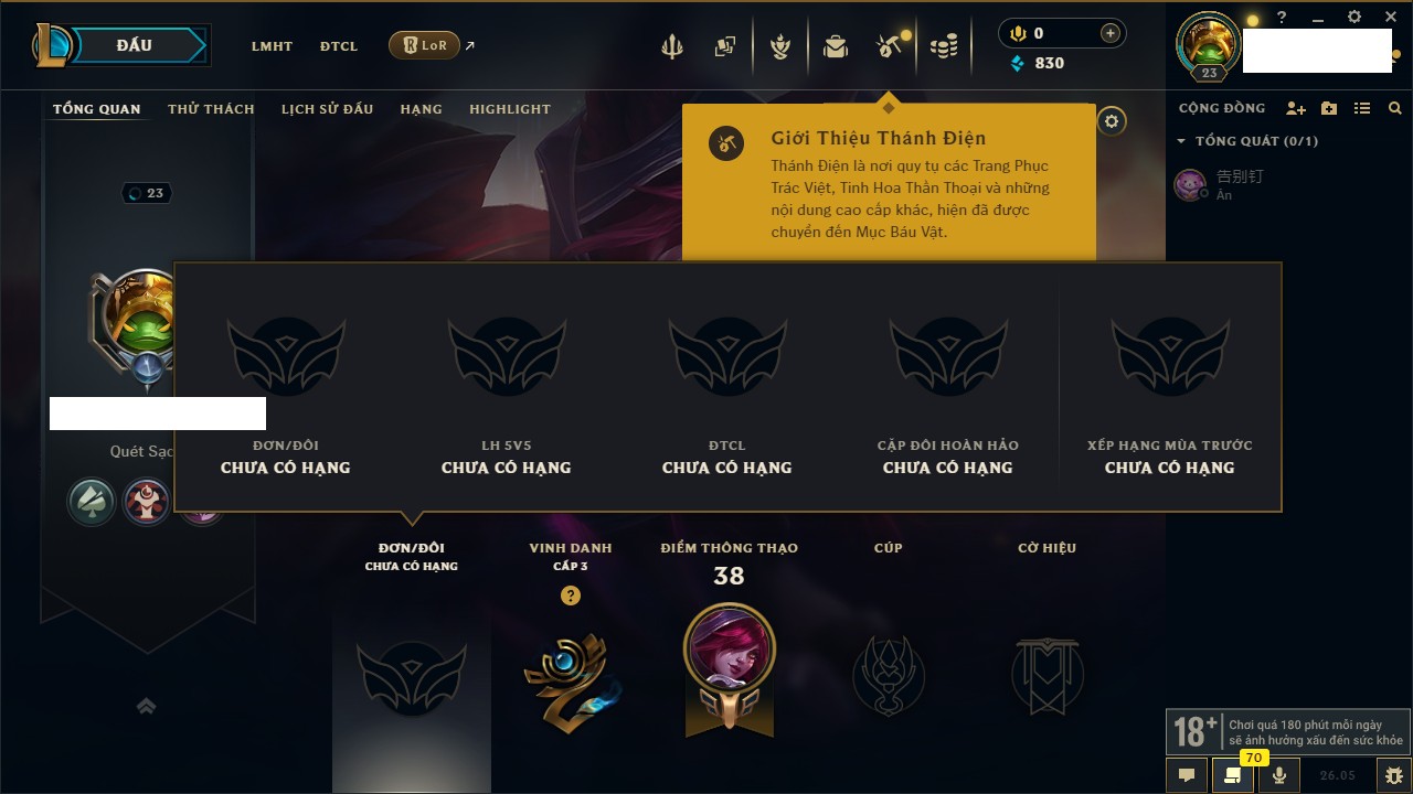 Rank Đơn: Chưa rank mùa nàoKhung: Chưa có khungTướng: 22 - Còn 1444 THXTrang Phục: 0Rank ĐTCL: Chưa RankLinh Thú: 8