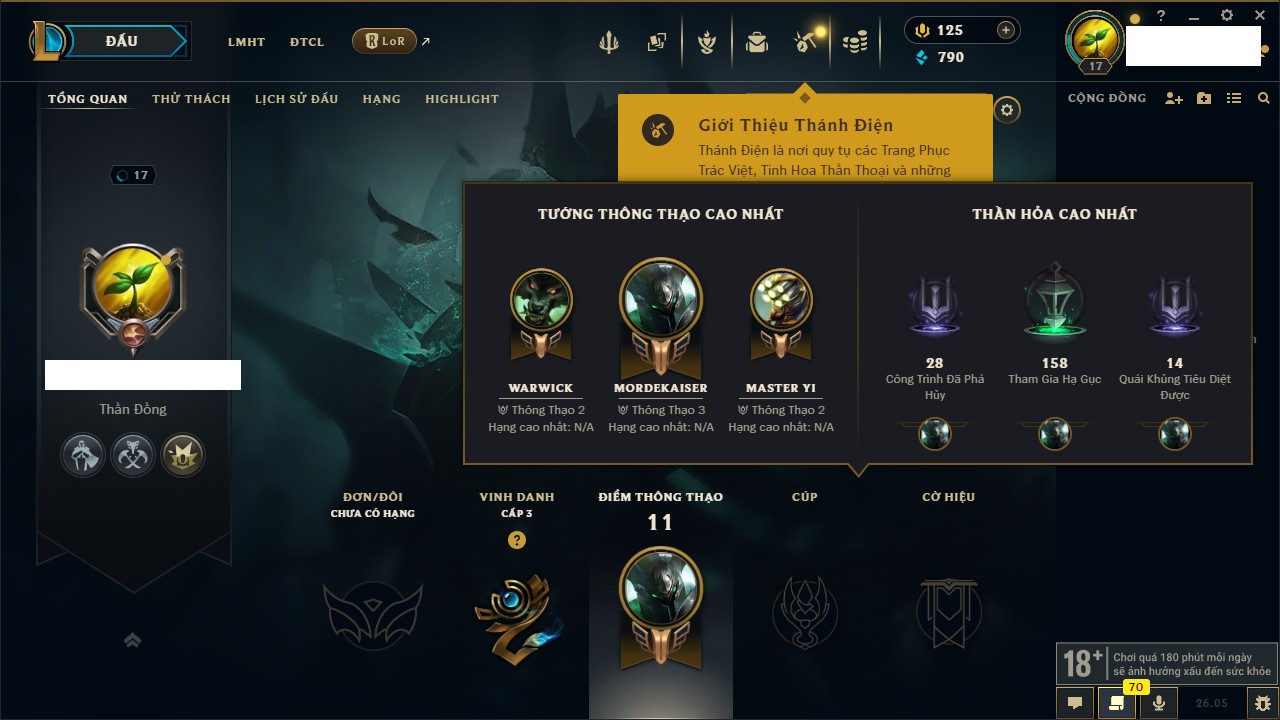 Rank Đơn: Chưa rank mùa nàoKhung: Chưa có khungTướng: 14 - Còn 2855 THXTrang Phục: 1Rank ĐTCL: Chưa RankLinh Thú: 9