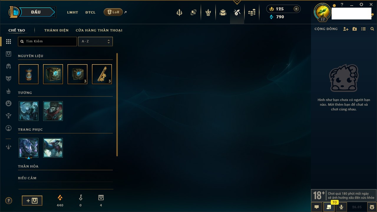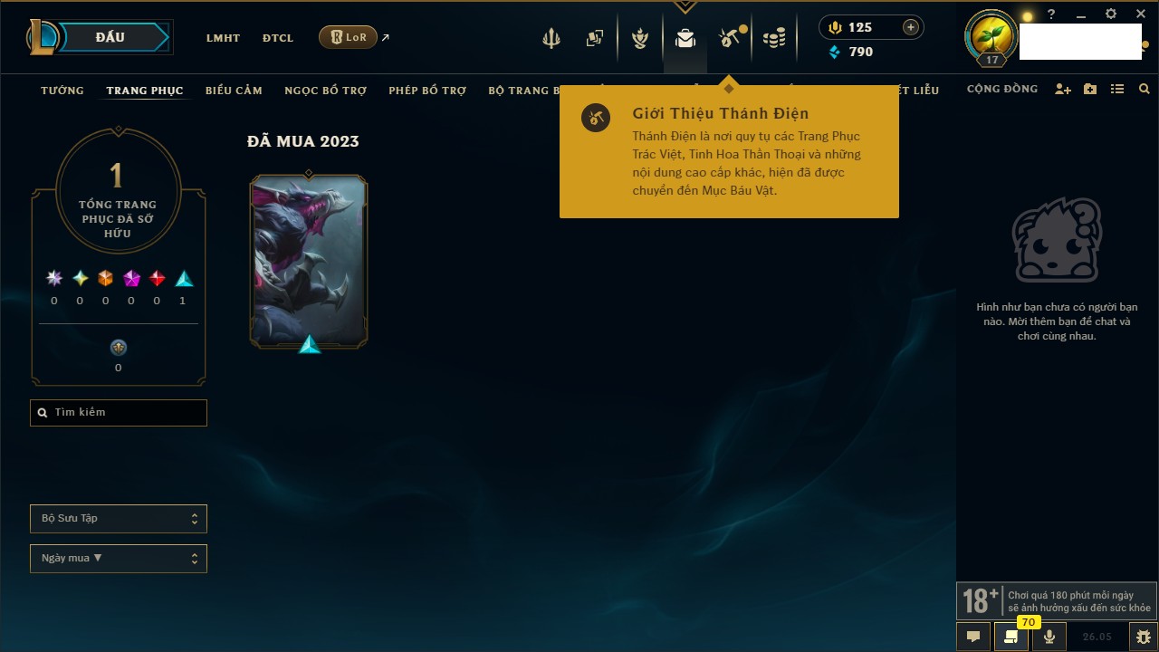 Rank Đơn: Chưa rank mùa nàoKhung: Chưa có khungTướng: 21 - Còn 90 THXTrang Phục: 0Rank ĐTCL: Chưa RankLinh Thú: 7
