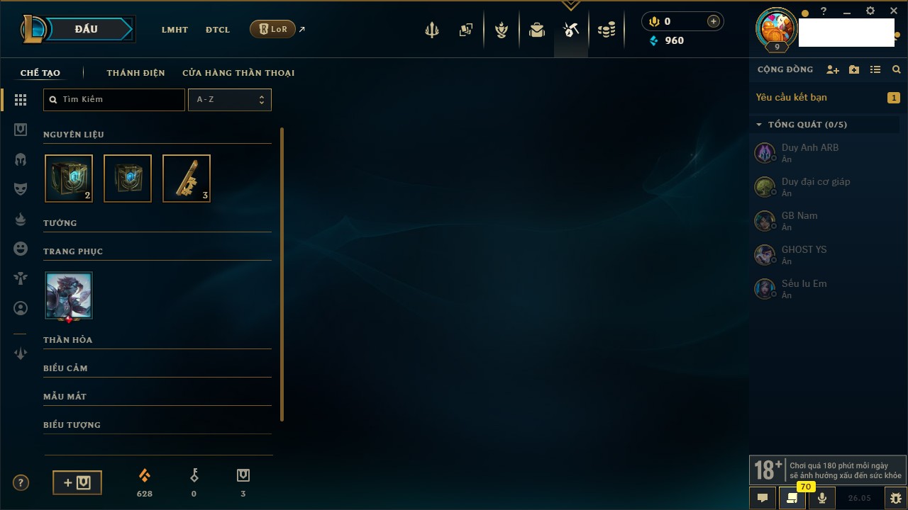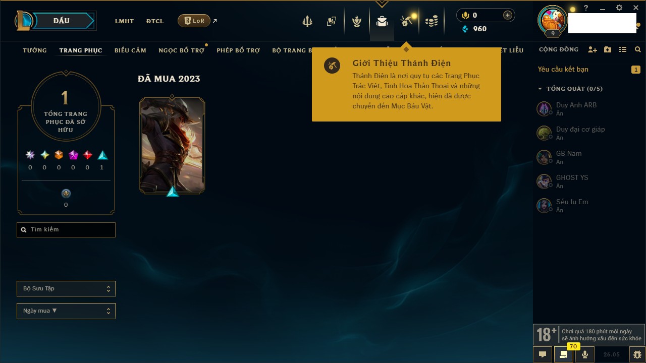 Rank Đơn: Chưa rank mùa nàoKhung: Chưa có khungTướng: 12 - Còn 2610 THXTrang Phục: 1Rank ĐTCL: Chưa RankLinh Thú: 5