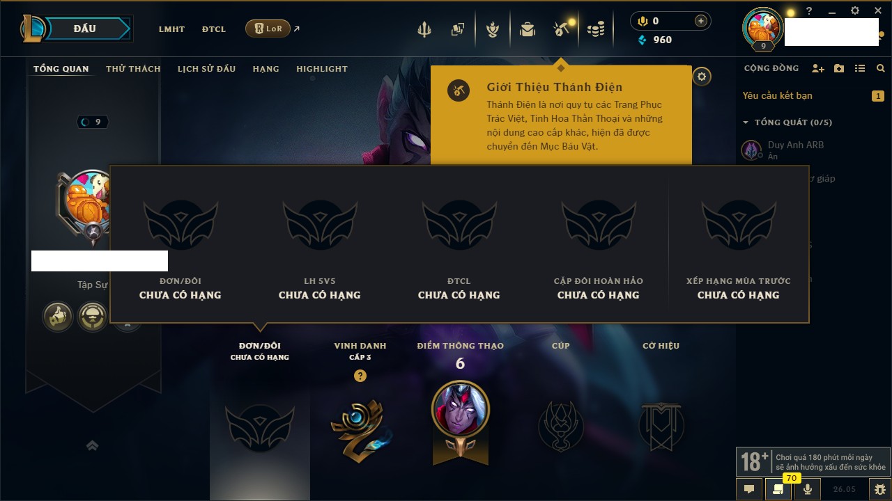 Rank Đơn: Chưa rank mùa nàoKhung: Chưa có khungTướng: 14 - Còn 2855 THXTrang Phục: 1Rank ĐTCL: Chưa RankLinh Thú: 9