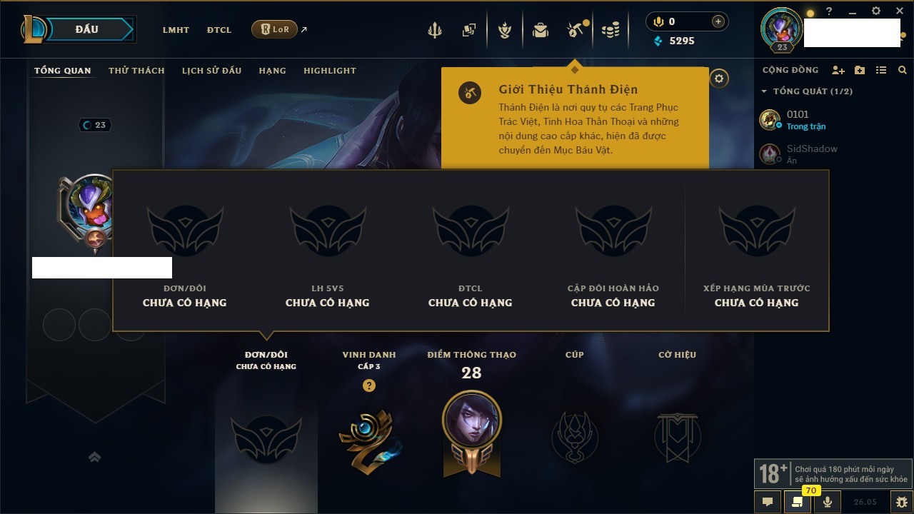 Rank Đơn: Chưa rank mùa nàoKhung: Chưa có khungTướng: 16 - Còn 375 THXTrang Phục: 0Rank ĐTCL: Chưa RankLinh Thú: 4