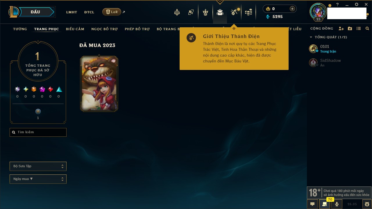 Rank Đơn: Chưa rank mùa nàoKhung: Chưa có khungTướng: 9 - Còn 4680 THXTrang Phục: 2Rank ĐTCL: Chưa RankLinh Thú: 9