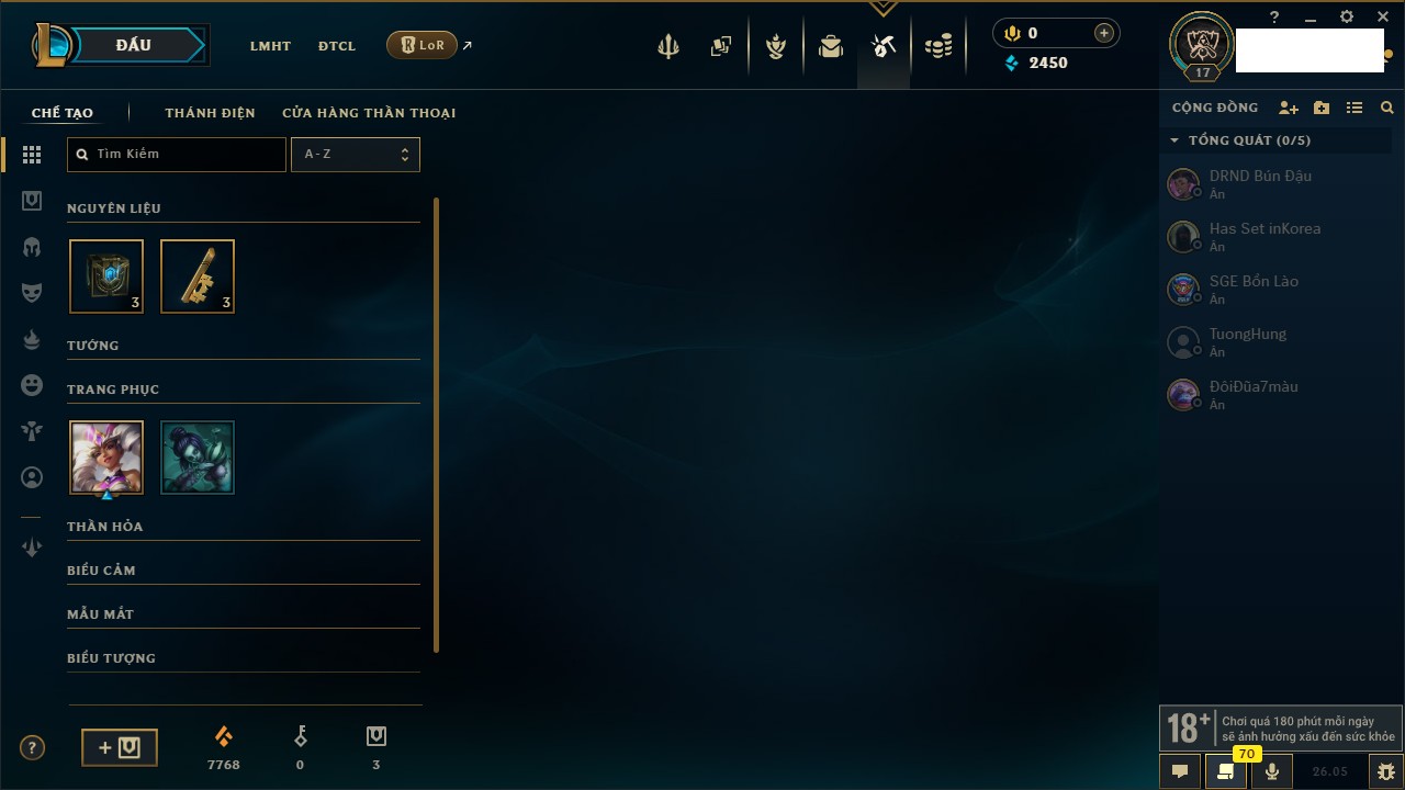 Rank Đơn: Chưa rank mùa nàoKhung: Chưa có khungTướng: 21 - Còn 90 THXTrang Phục: 0Rank ĐTCL: Chưa RankLinh Thú: 7