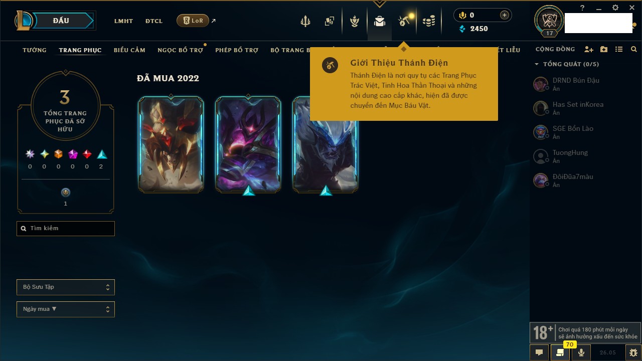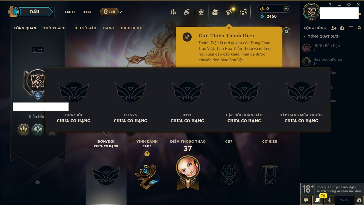 Rank Đơn: Chưa rank mùa nàoKhung: Chưa có khungTướng: 17 - Còn 1100 THXTrang Phục: 0Rank ĐTCL: Chưa RankLinh Thú: 5