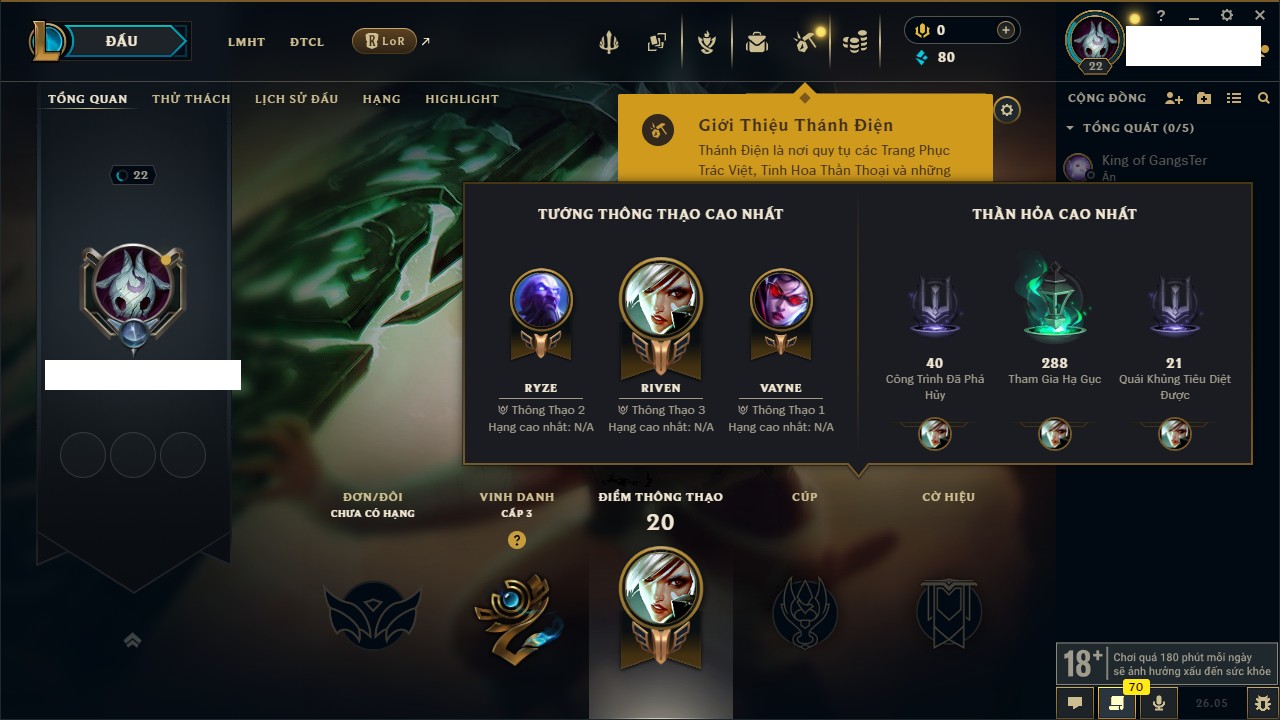 Rank Đơn: Chưa rank mùa nàoKhung: Chưa có khungTướng: 12 - Còn 2370 THXTrang Phục: 0Rank ĐTCL: Chưa RankLinh Thú: 7