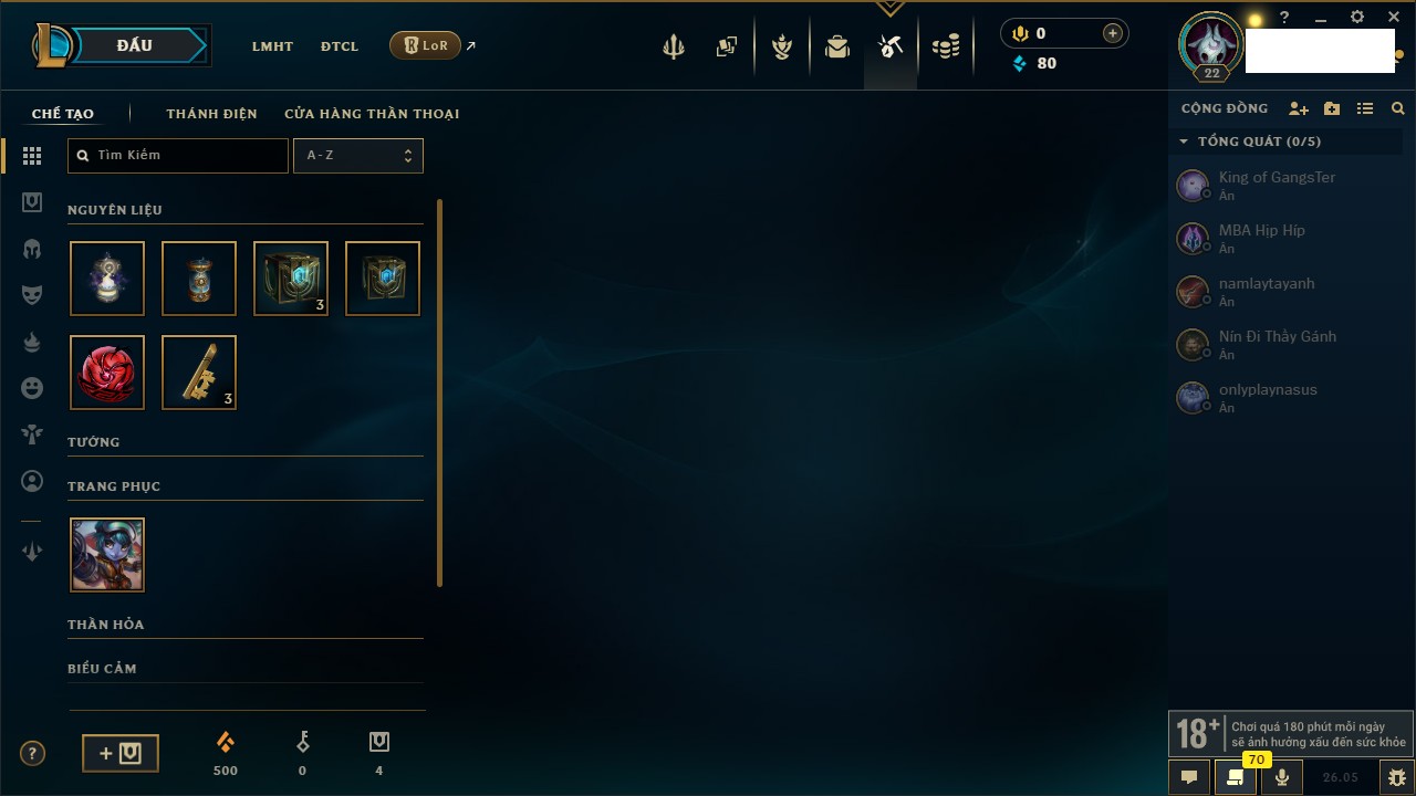 Rank Đơn: Chưa rank mùa nàoKhung: Chưa có khungTướng: 10 - Còn 2055 THXTrang Phục: 0Rank ĐTCL: Chưa RankLinh Thú: 4