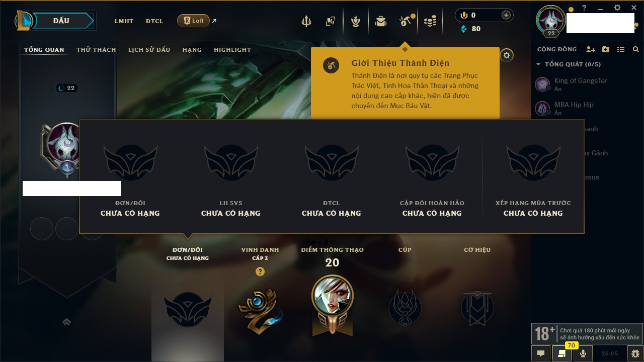 Rank Đơn: Chưa rank mùa nàoKhung: Chưa có khungTướng: 13 - Còn 470 THXTrang Phục: 0Rank ĐTCL: Chưa RankLinh Thú: 5