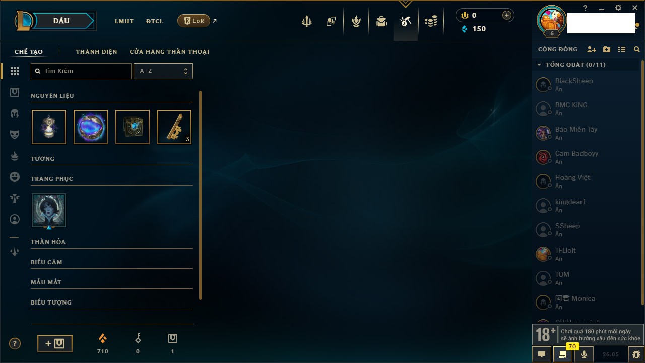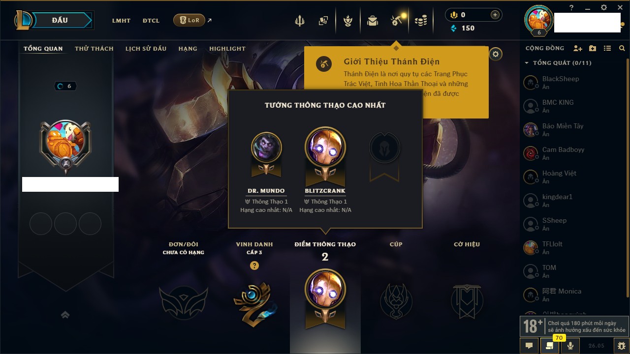 Rank Đơn: Chưa rank mùa nàoKhung: Chưa có khungTướng: 10 - Còn 2055 THXTrang Phục: 0Rank ĐTCL: Chưa RankLinh Thú: 4