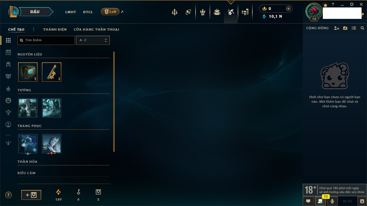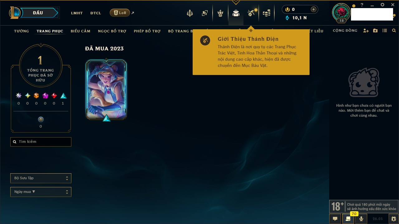 Rank Đơn: Chưa rank mùa nàoKhung: Chưa có khungTướng: 7 - Còn 4799 THXTrang Phục: 4Rank ĐTCL: Chưa RankLinh Thú: 24
