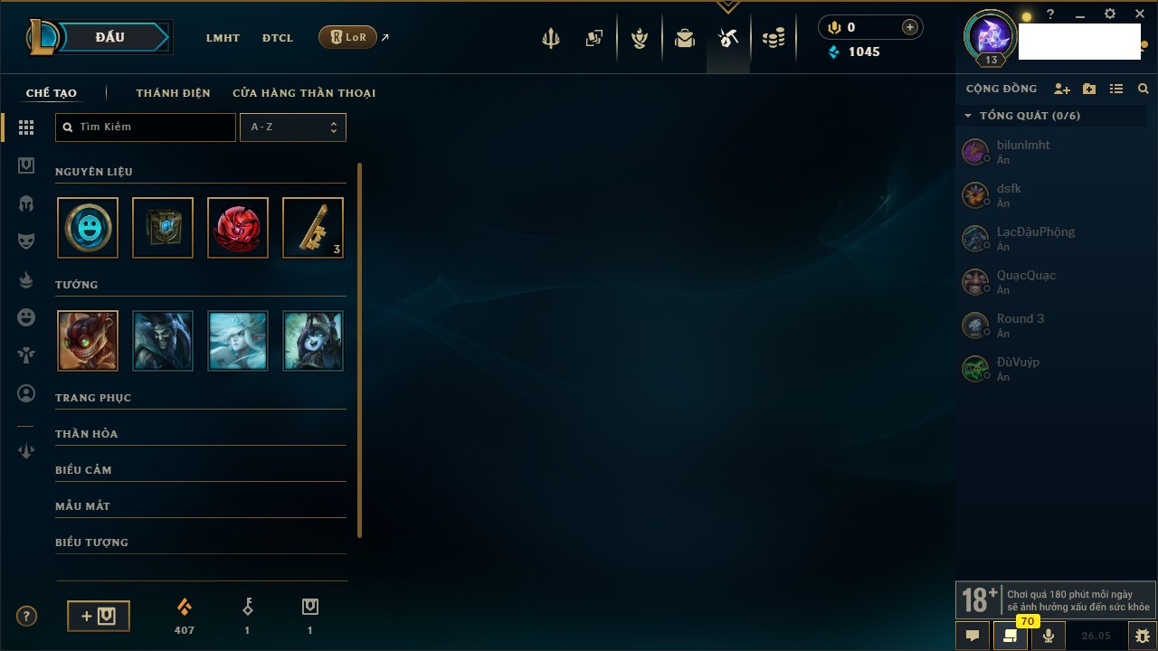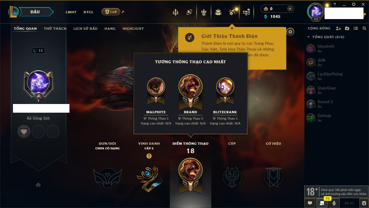 Rank Đơn: Chưa rank mùa nàoKhung: Chưa có khungTướng: 14 - Còn 2855 THXTrang Phục: 1Rank ĐTCL: Chưa RankLinh Thú: 9