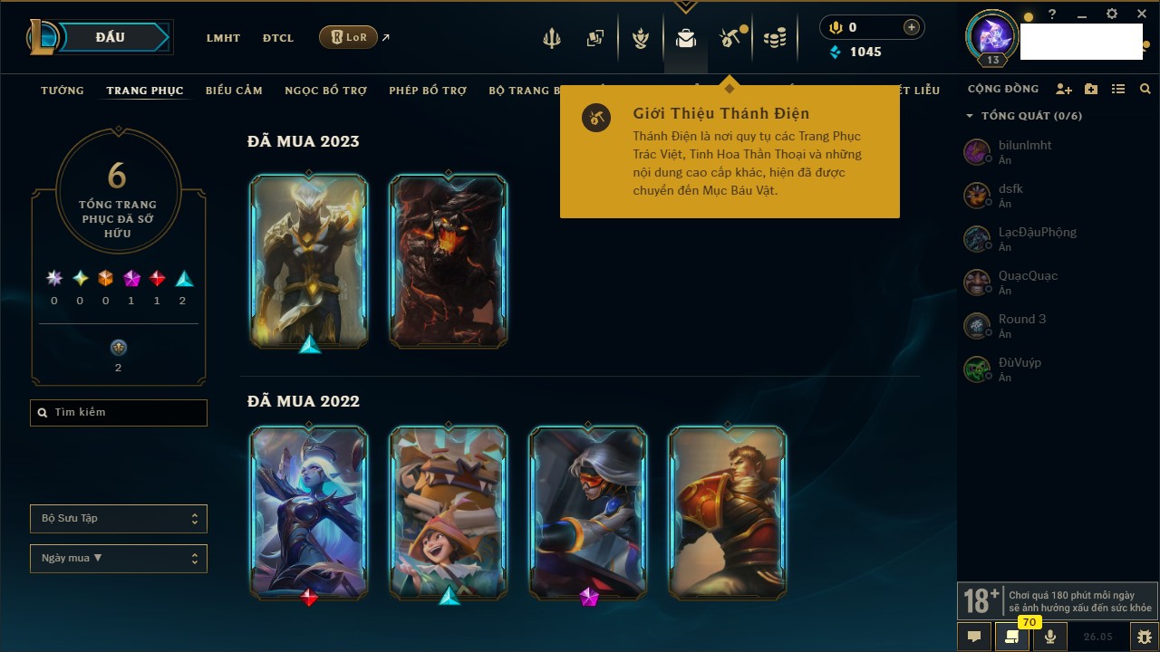 Rank Đơn: Chưa rank mùa nàoKhung: Chưa có khungTướng: 12 - Còn 2610 THXTrang Phục: 1Rank ĐTCL: Chưa RankLinh Thú: 5