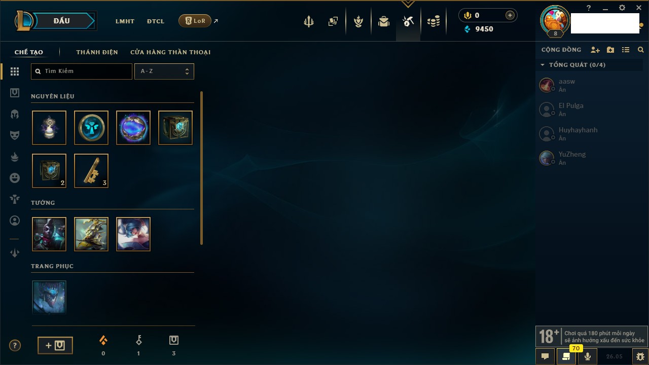 Rank Đơn: Chưa rank mùa nàoKhung: Chưa có khungTướng: 14 - Còn 834 THXTrang Phục: 0Rank ĐTCL: Chưa RankLinh Thú: 4