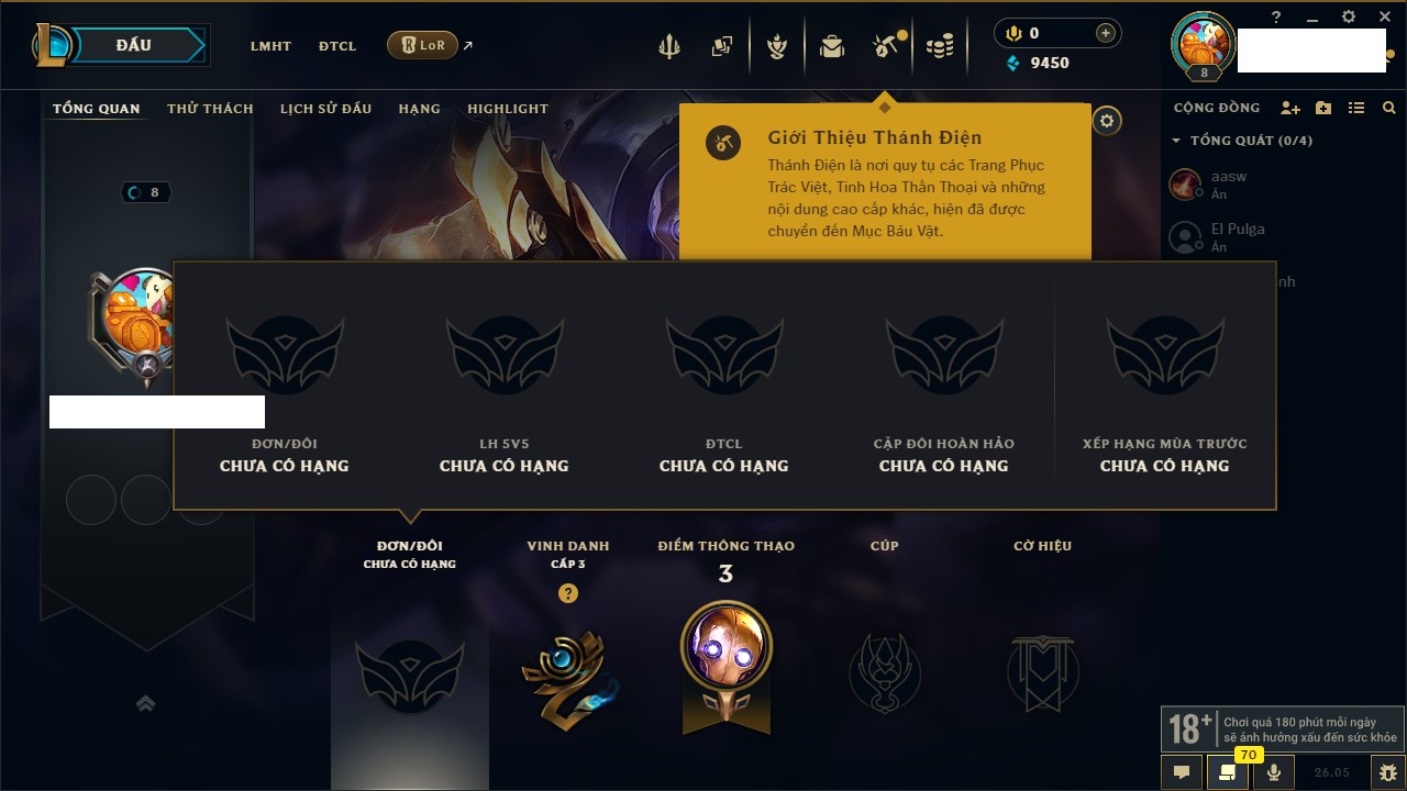 Rank Đơn: Chưa rank mùa nàoKhung: Chưa có khungTướng: 13 - Còn 470 THXTrang Phục: 0Rank ĐTCL: Chưa RankLinh Thú: 5
