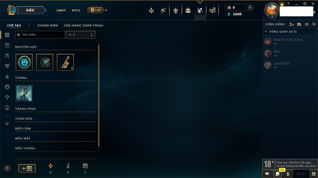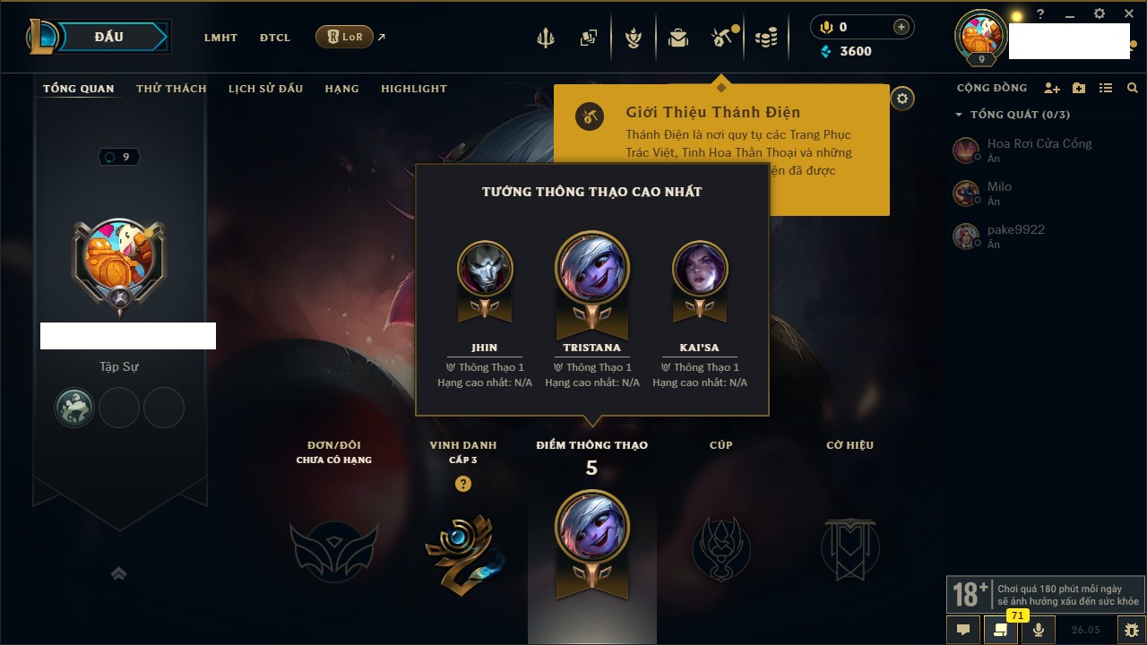 Rank Đơn: Chưa rank mùa nàoKhung: Chưa có khungTướng: 10 - Còn 2055 THXTrang Phục: 0Rank ĐTCL: Chưa RankLinh Thú: 4