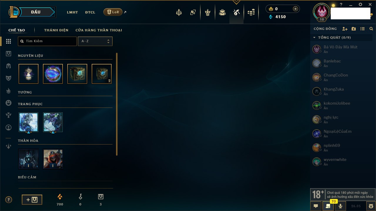 Rank Đơn: Chưa rank mùa nàoKhung: Chưa có khungTướng: 7 - Còn 4799 THXTrang Phục: 4Rank ĐTCL: Chưa RankLinh Thú: 24