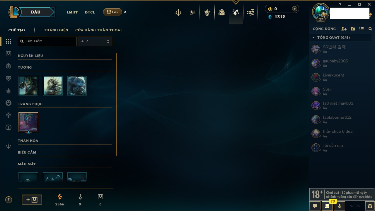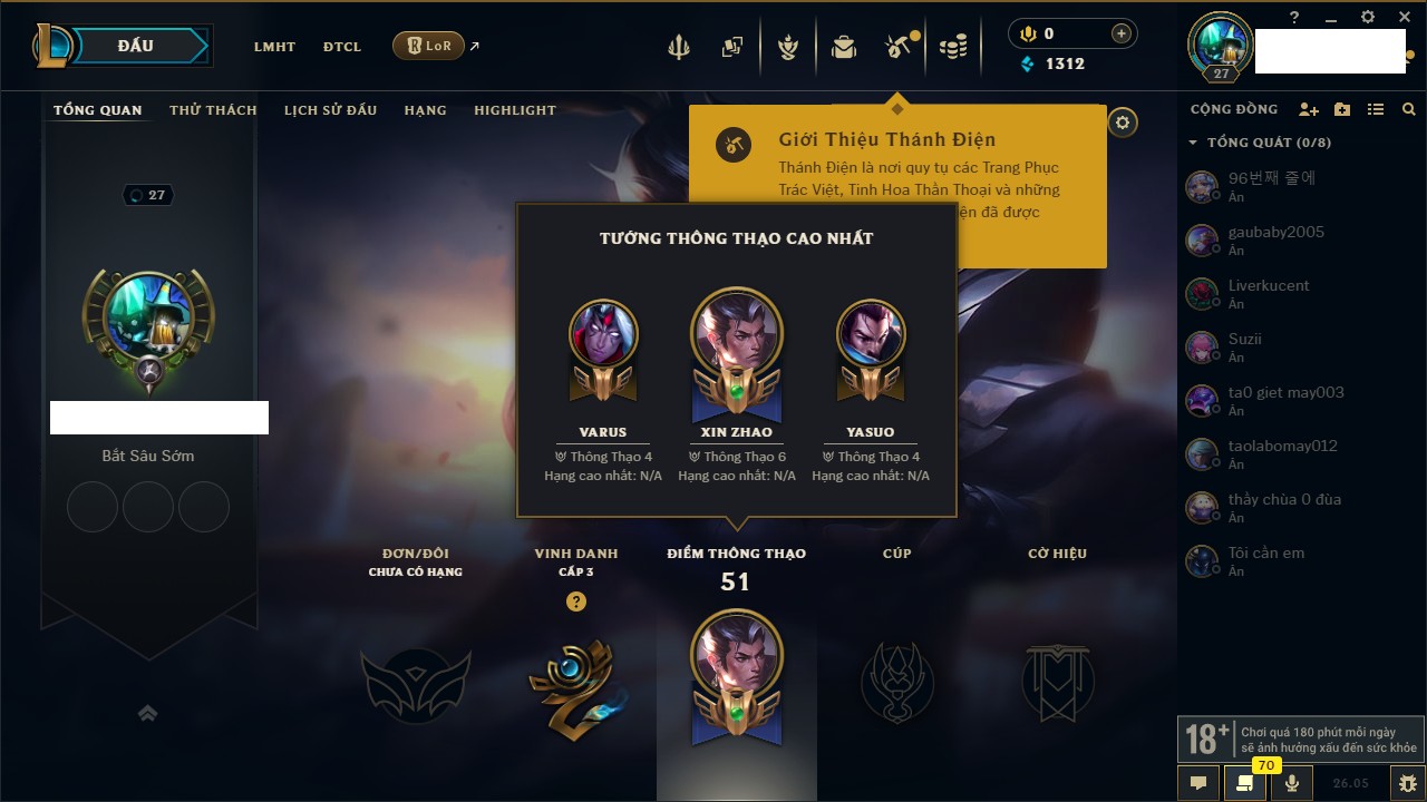 Rank Đơn: Chưa rank mùa nàoKhung: Chưa có khungTướng: 21 - Còn 90 THXTrang Phục: 0Rank ĐTCL: Chưa RankLinh Thú: 7