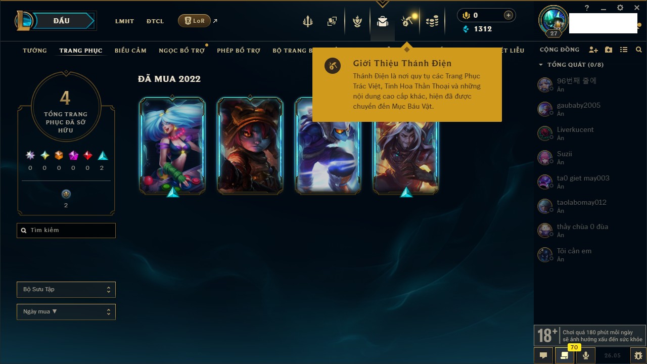 Rank Đơn: Chưa rank mùa nàoKhung: Chưa có khungTướng: 22 - Còn 1444 THXTrang Phục: 0Rank ĐTCL: Chưa RankLinh Thú: 8