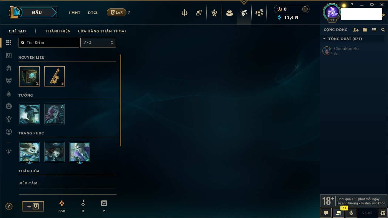 Rank Đơn: Chưa rank mùa nàoKhung: Chưa có khungTướng: 12 - Còn 2370 THXTrang Phục: 0Rank ĐTCL: Chưa RankLinh Thú: 7