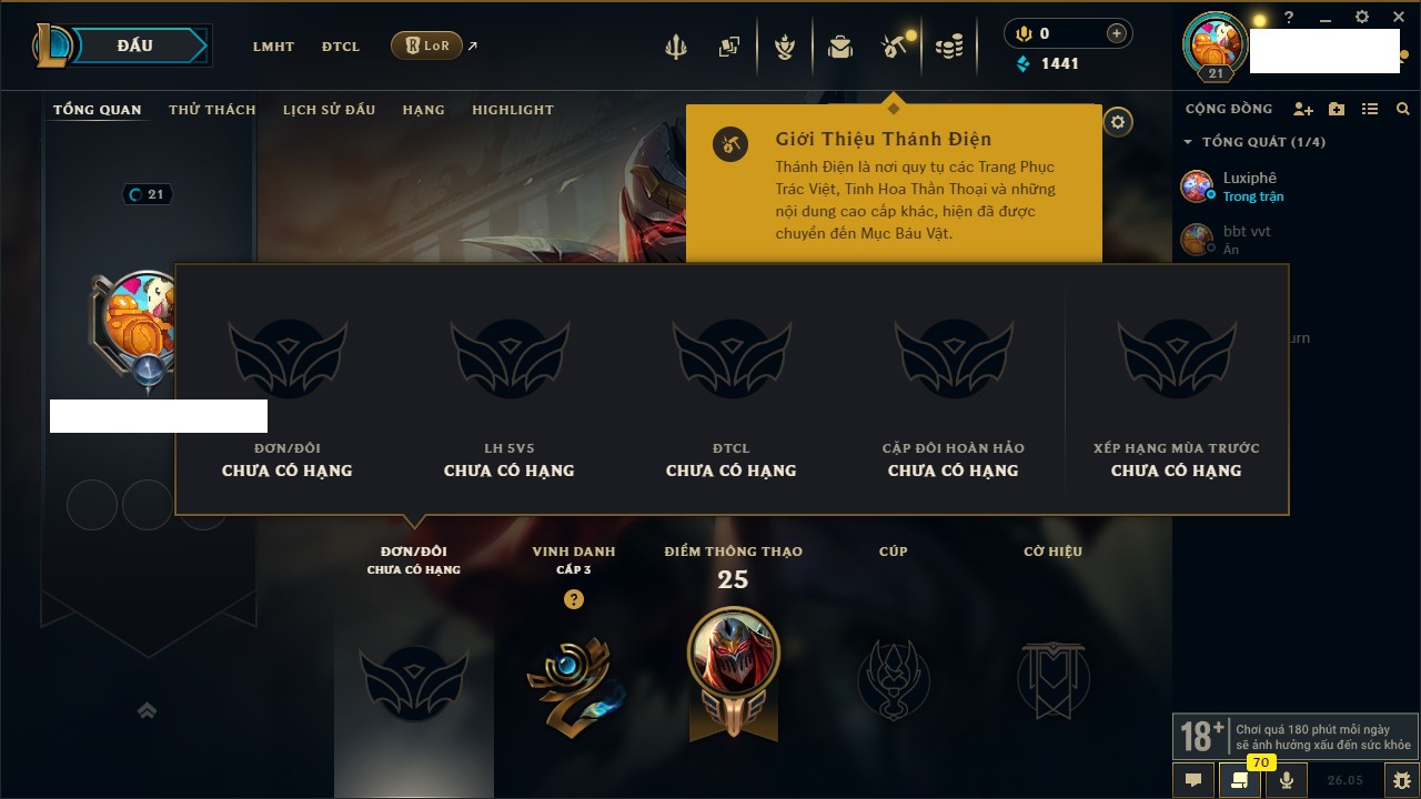 Rank Đơn: Chưa rank mùa nàoKhung: Chưa có khungTướng: 21 - Còn 90 THXTrang Phục: 0Rank ĐTCL: Chưa RankLinh Thú: 7
