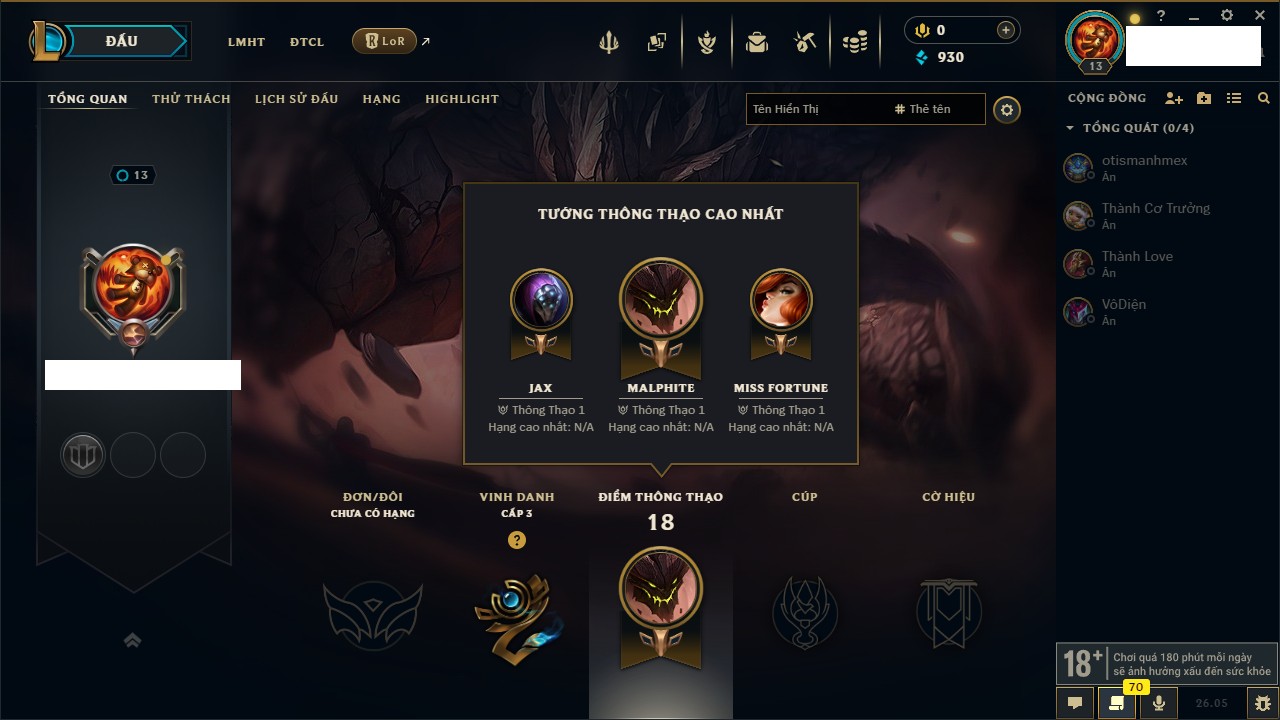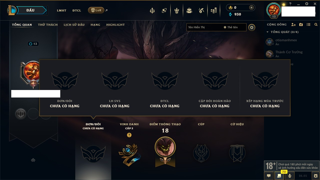 Rank Đơn: Chưa rank mùa nàoKhung: Chưa có khungTướng: 22 - Còn 1444 THXTrang Phục: 0Rank ĐTCL: Chưa RankLinh Thú: 8