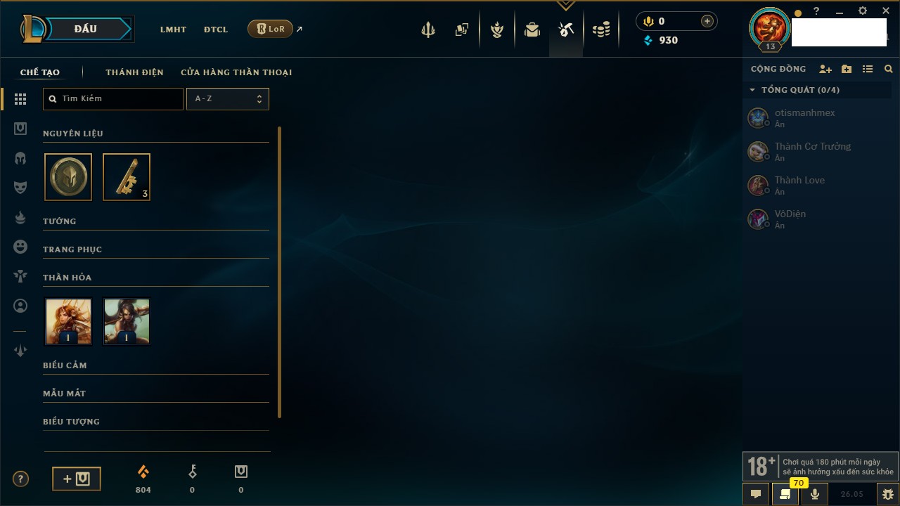 Rank Đơn: Chưa rank mùa nàoKhung: Chưa có khungTướng: 21 - Còn 90 THXTrang Phục: 0Rank ĐTCL: Chưa RankLinh Thú: 7