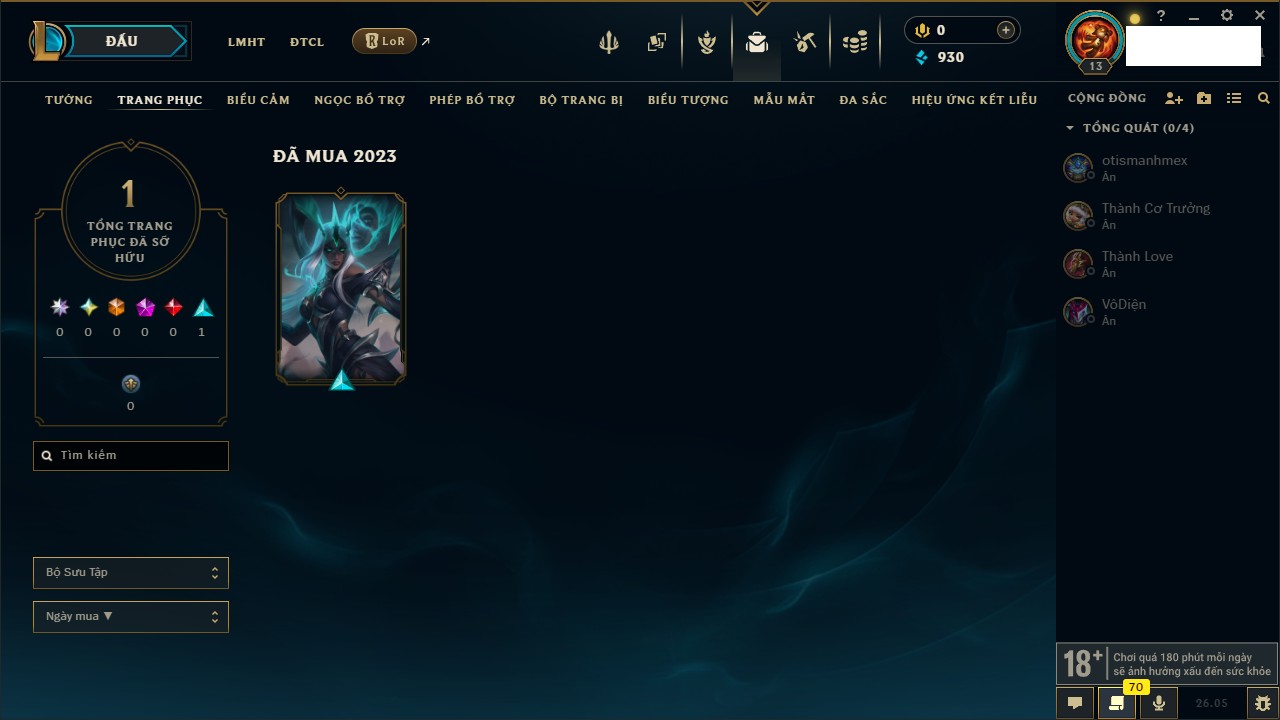 Rank Đơn: Chưa rank mùa nàoKhung: Chưa có khungTướng: 12 - Còn 980 THXTrang Phục: 6Rank ĐTCL: Chưa RankLinh Thú: 5