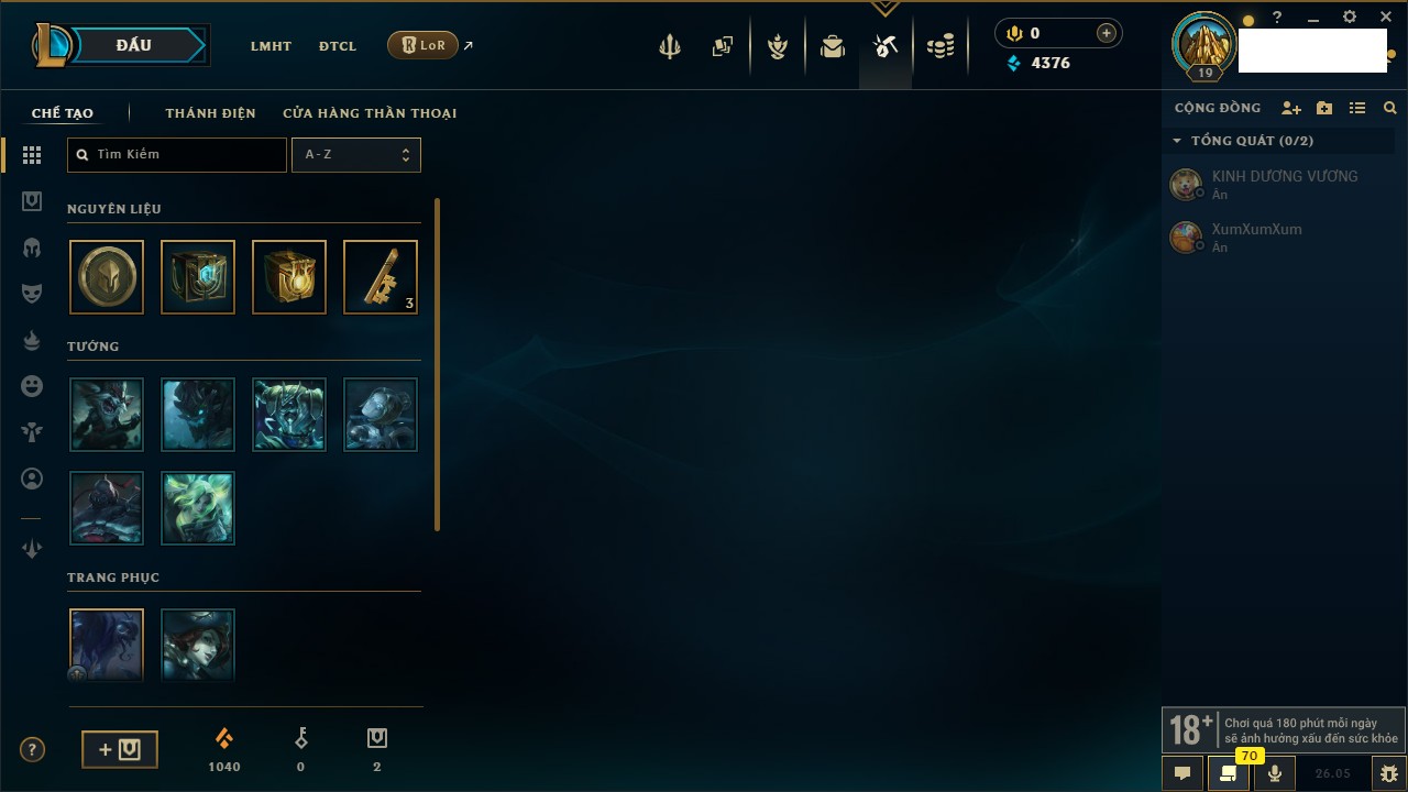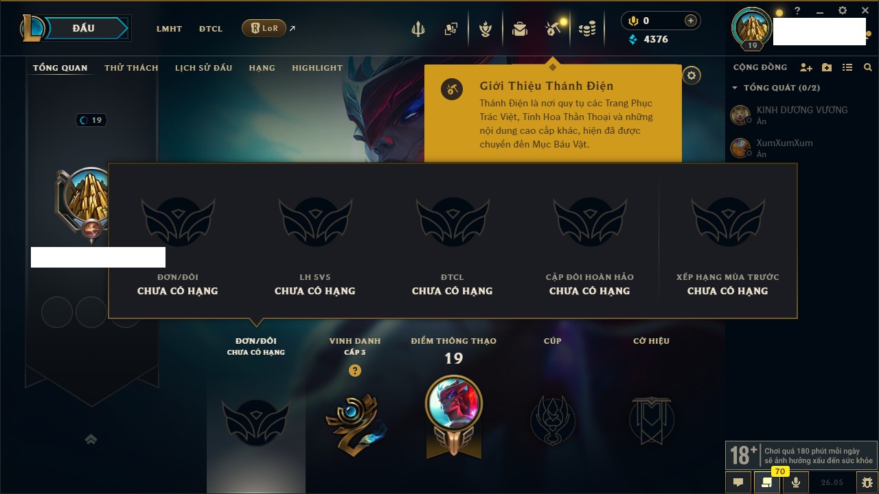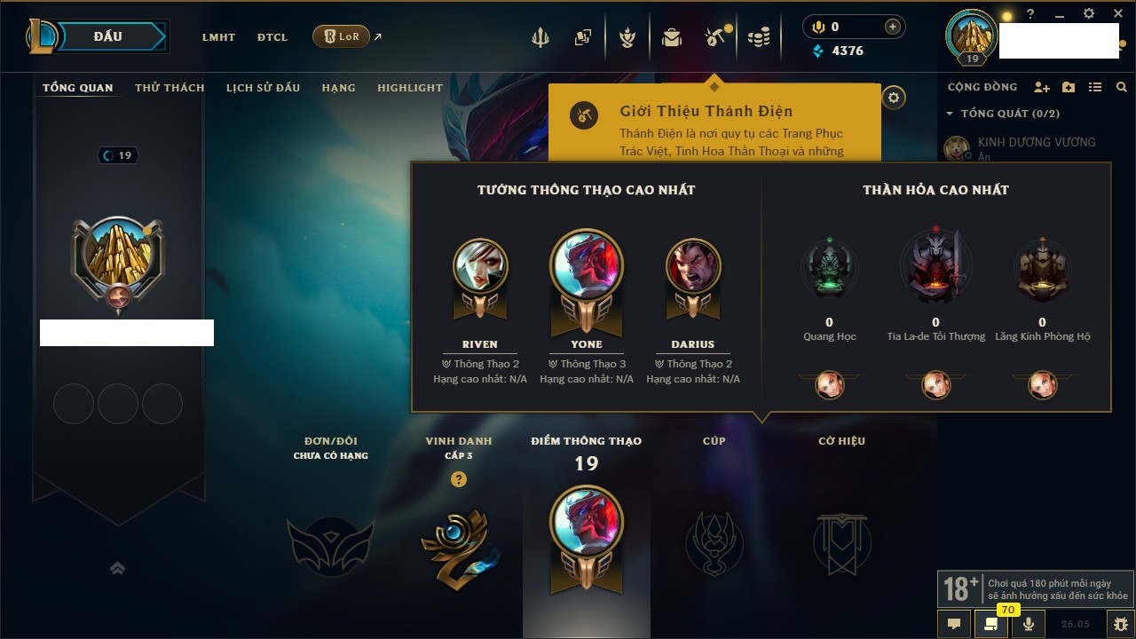 Rank Đơn: Chưa rank mùa nàoKhung: Chưa có khungTướng: 4 - Còn 6647 THXTrang Phục: 2Rank ĐTCL: Chưa RankLinh Thú: 5