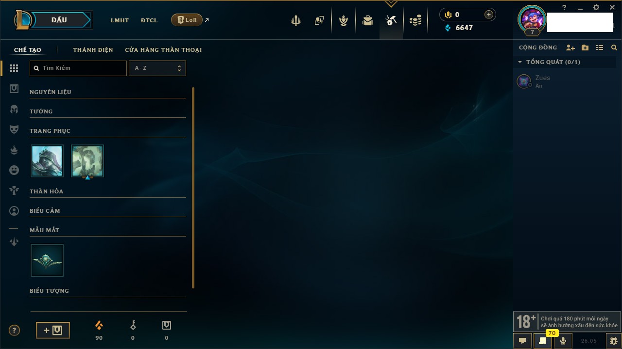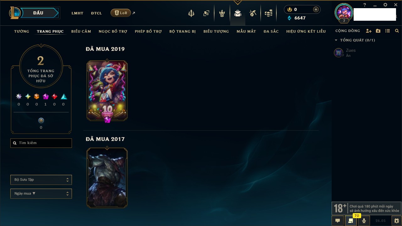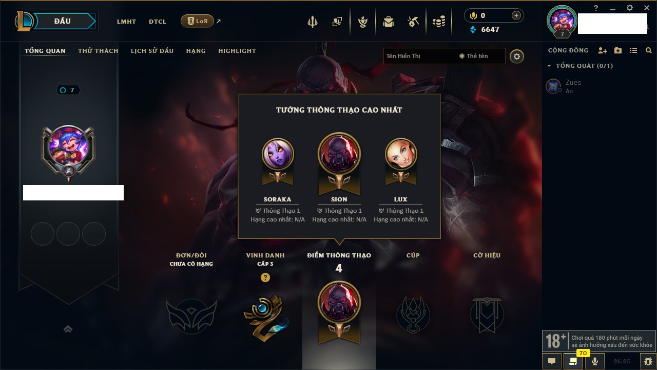 Rank Đơn: Chưa rank mùa nàoKhung: Chưa có khungTướng: 7 - Còn 4799 THXTrang Phục: 4Rank ĐTCL: Chưa RankLinh Thú: 24