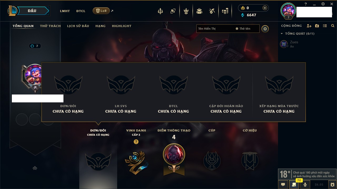 Rank Đơn: Chưa rank mùa nàoKhung: Chưa có khungTướng: 4 - Còn 6647 THXTrang Phục: 2Rank ĐTCL: Chưa RankLinh Thú: 5