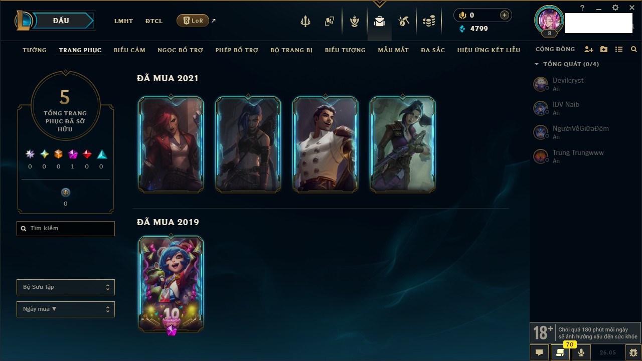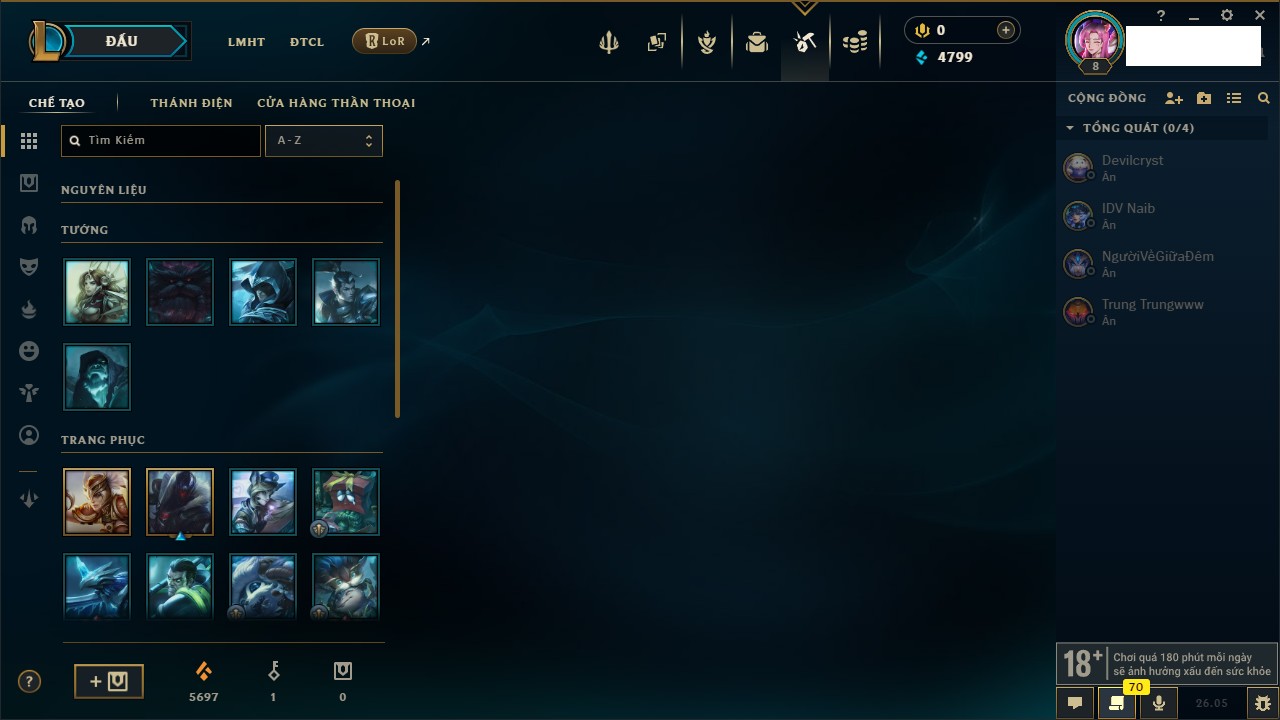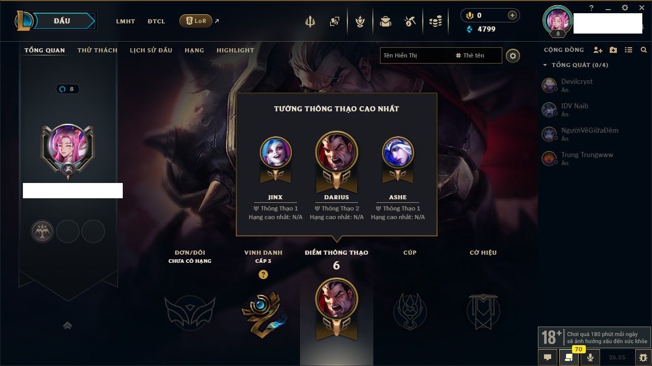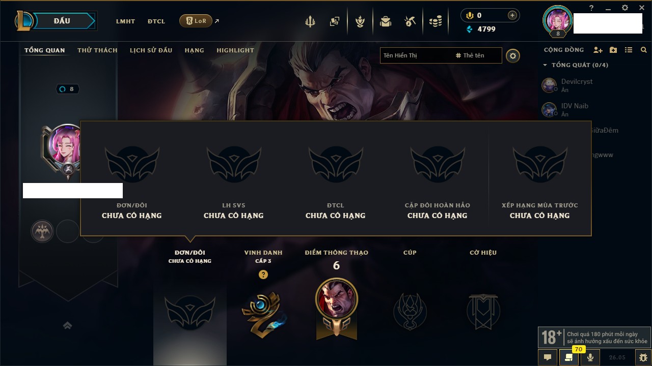 Rank Đơn: Chưa rank mùa nàoKhung: Chưa có khungTướng: 7 - Còn 4799 THXTrang Phục: 4Rank ĐTCL: Chưa RankLinh Thú: 24
