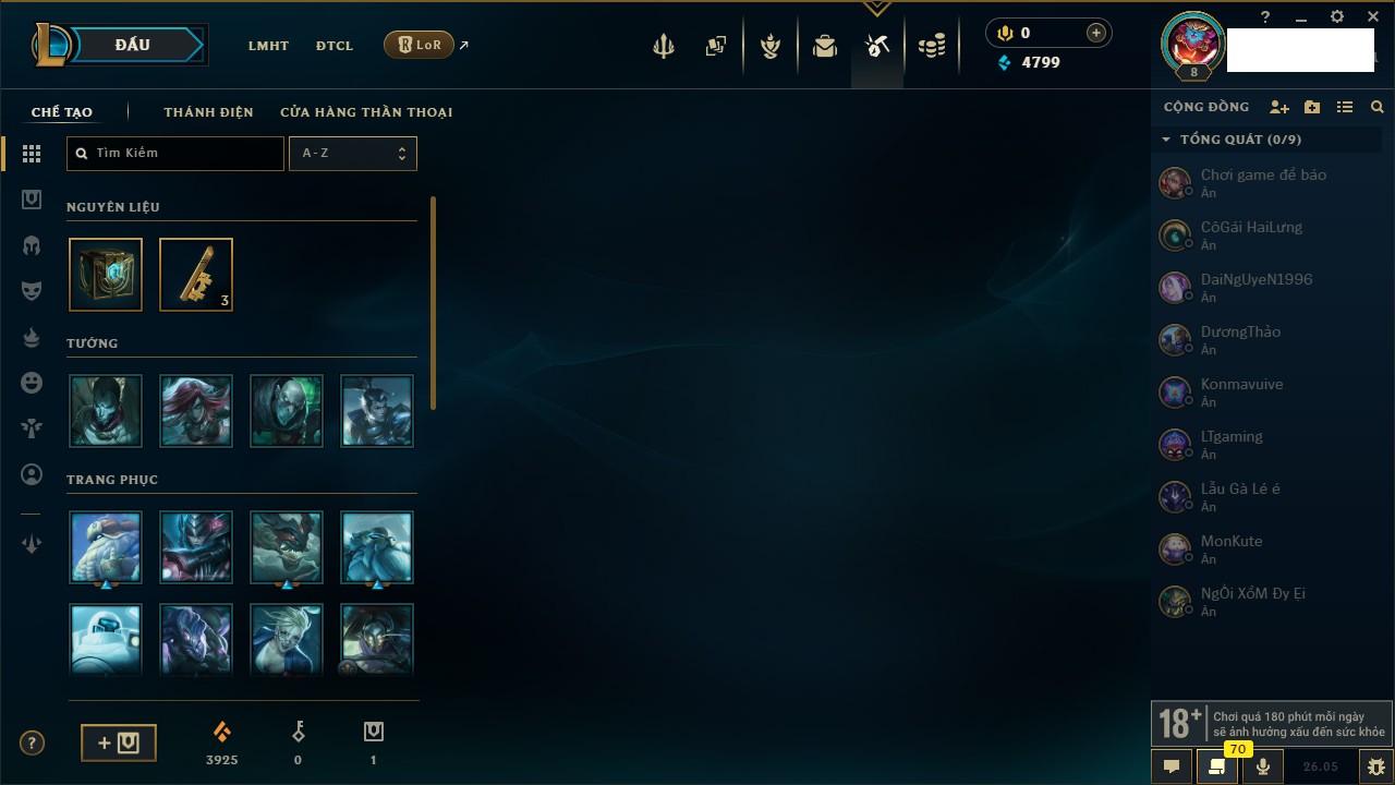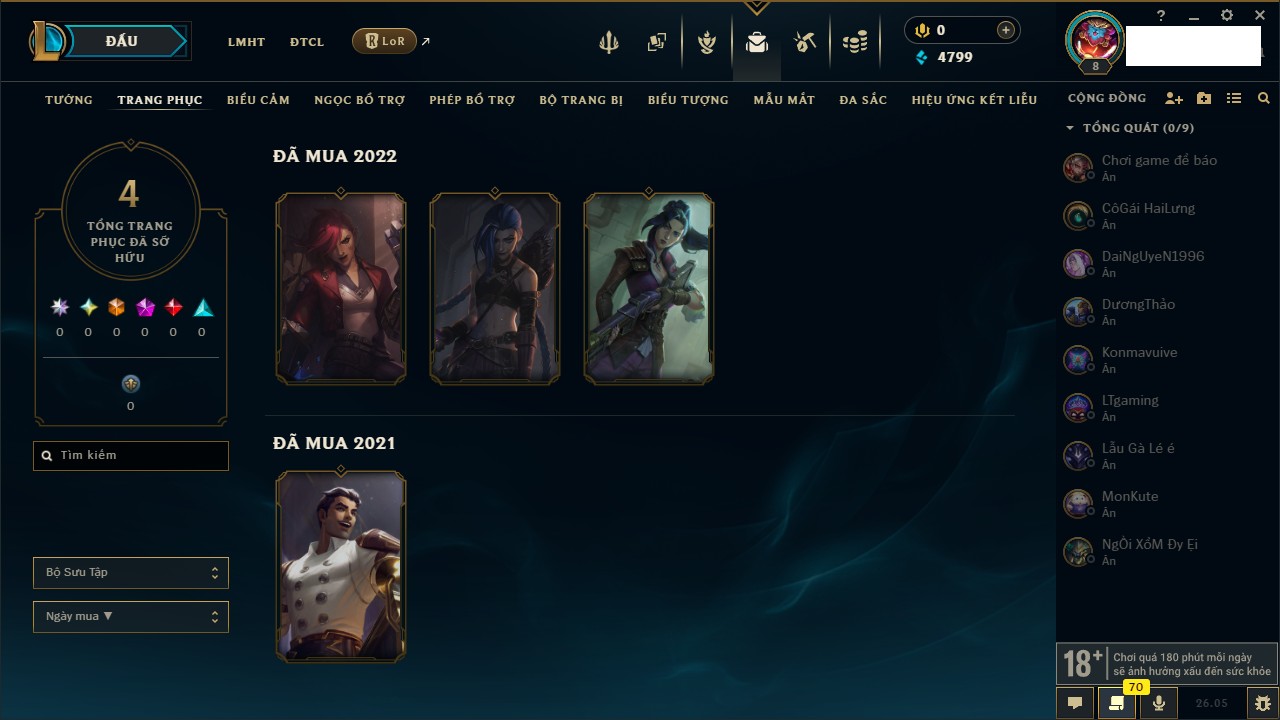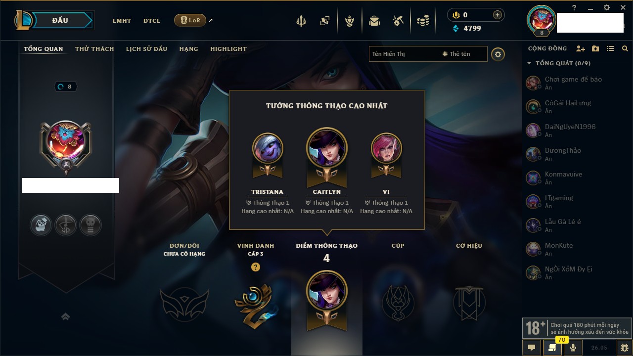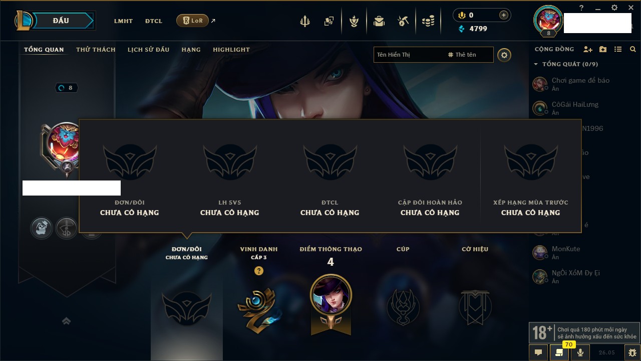 Rank Đơn: Chưa rank mùa nàoKhung: Chưa có khungTướng: 7 - Còn 4799 THXTrang Phục: 4Rank ĐTCL: Chưa RankLinh Thú: 24
