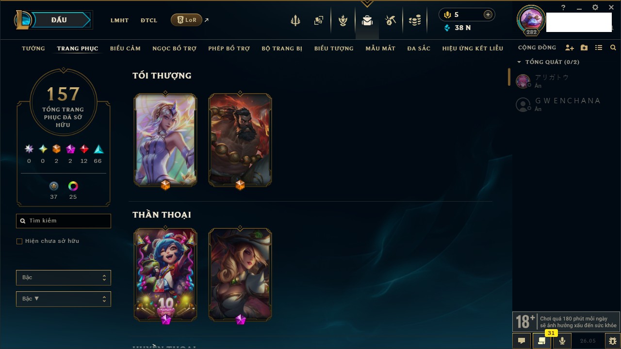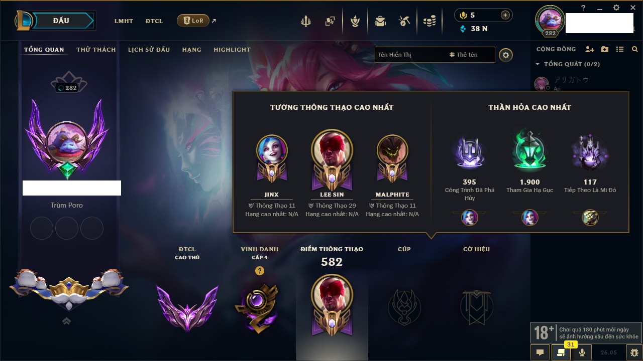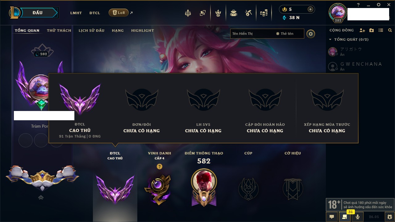 Rank Đơn: Chưa RankKhung: Bạch kimTướng: 168 - Còn 83003 THXTrang Phục: 210Rank ĐTCL: Chưa RankLinh Thú: 36