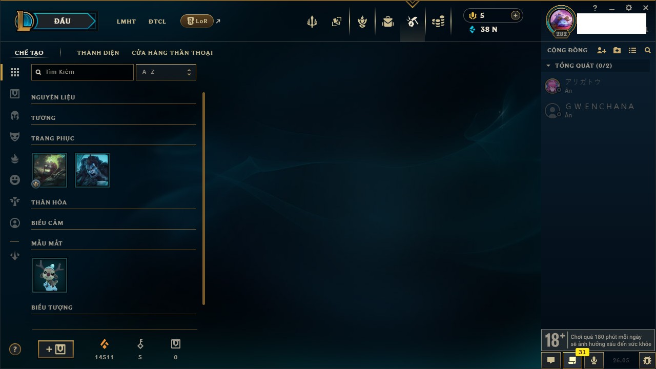 Rank Đơn: Chưa RankKhung: Chưa có khungTướng: 171 - Còn 414006 THXTrang Phục: 207Rank ĐTCL: Chưa RankLinh Thú: 55
