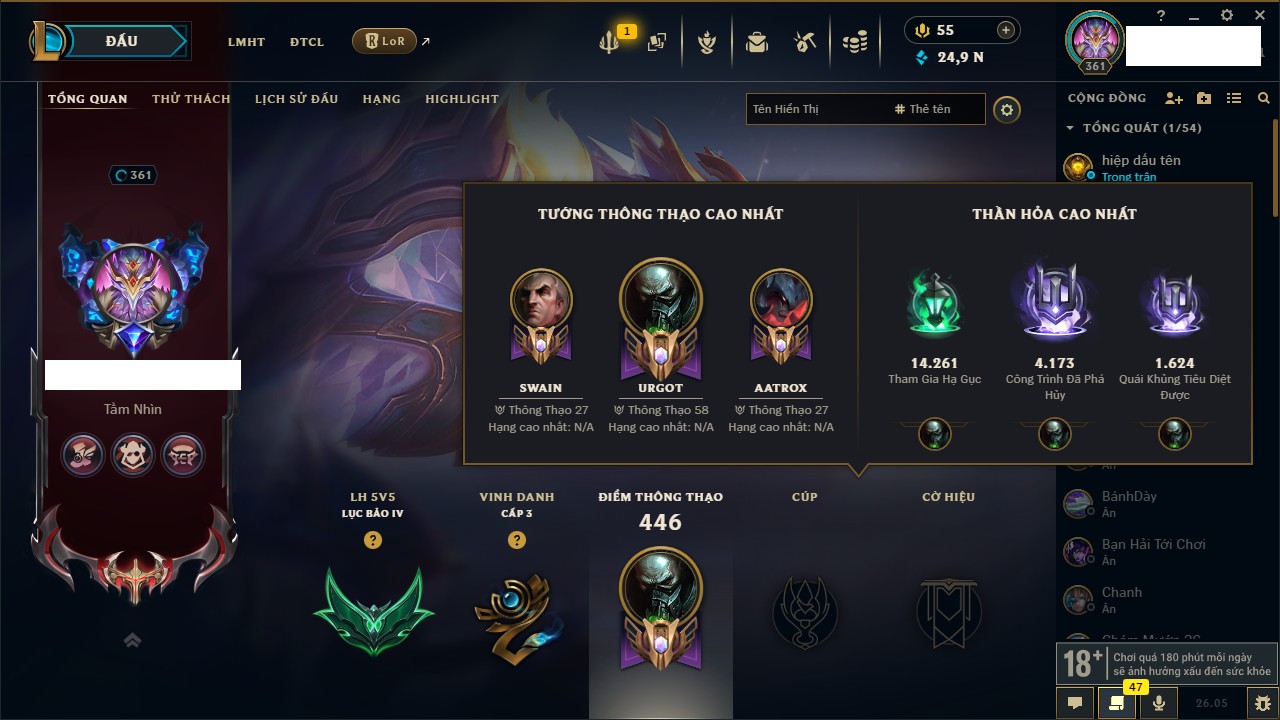 Rank Đơn: Chưa RankKhung: VàngTướng: 171 - Còn 25166 THXTrang Phục: 170Rank ĐTCL: Chưa RankLinh Thú: 124