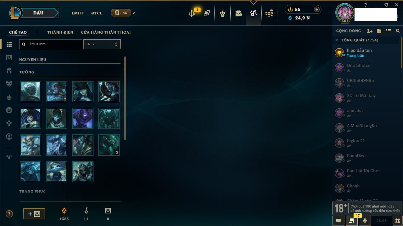 Rank Đơn: Chưa RankKhung: Chưa có khungTướng: 167 - Còn 31543 THXTrang Phục: 239Rank ĐTCL: Chưa RankLinh Thú: 97