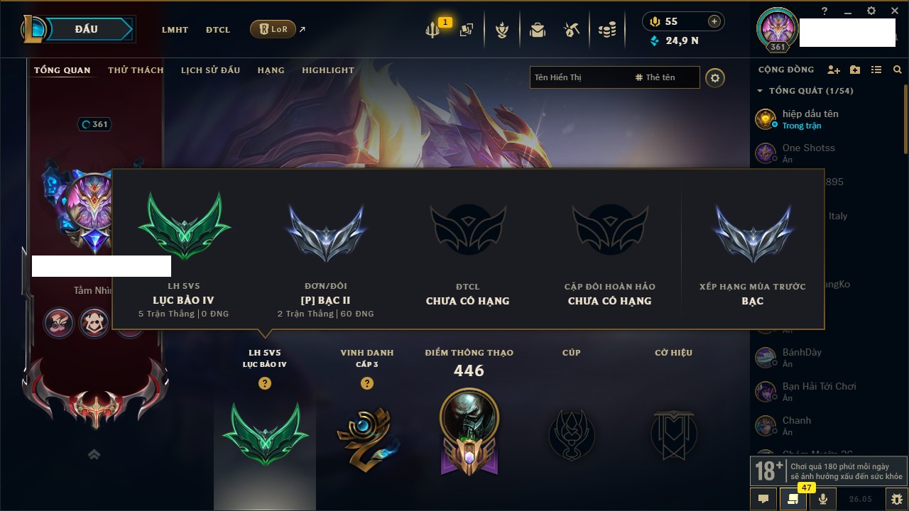 Rank Đơn: Bạc IIKhung: BạcTướng: 172 - Còn 24946 THXTrang Phục: 198Rank ĐTCL: Chưa RankLinh Thú: 158
