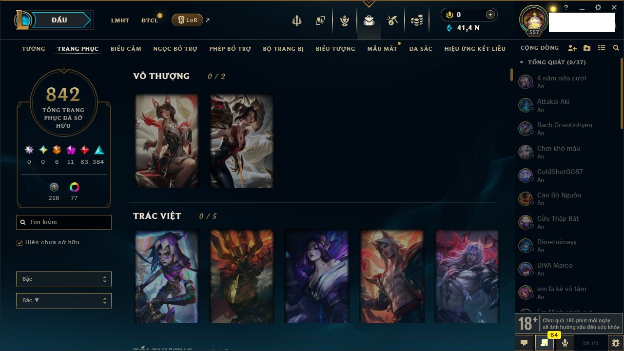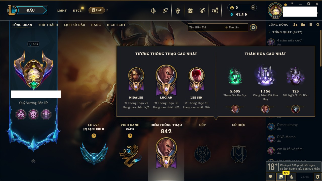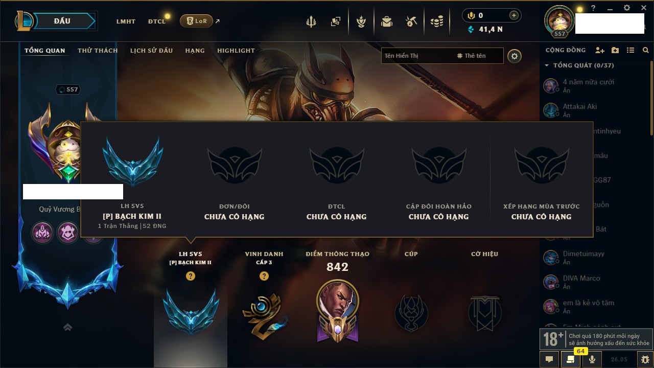 Rank Đơn: Chưa Rank Khung: Chưa có khung Tướng: 172 - Còn 41485 THX Trang Phục: 842 Rank ĐTCL: Chưa Rank Linh Thú: 121