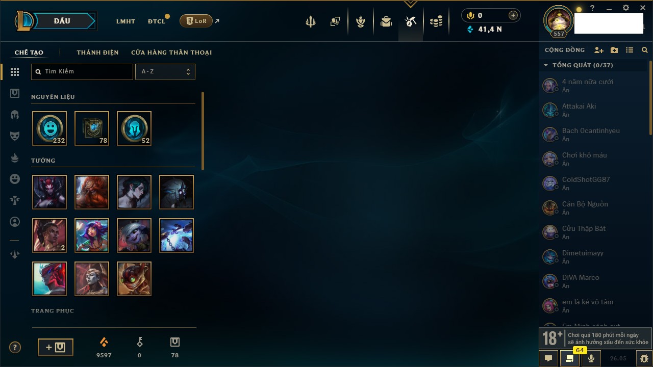 Rank Đơn: Chưa rank mùa nào Khung: Chưa có khung Tướng: 1 - Còn 6000 THX Trang Phục: 0 Rank ĐTCL: Chưa rank mùa nào Linh Thú: 18