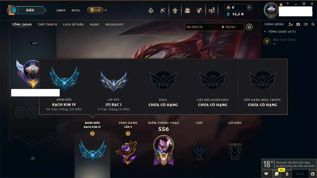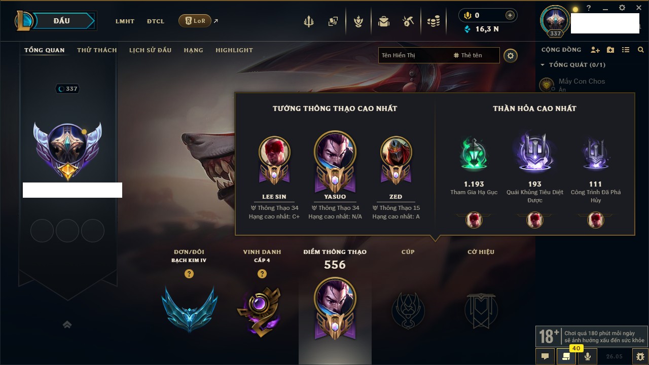 Rank Đơn: Bạch Kim IVKhung: Chưa có khungTướng: 143 - Còn 16385 THXTrang Phục: 191Rank ĐTCL: Chưa RankLinh Thú: 17