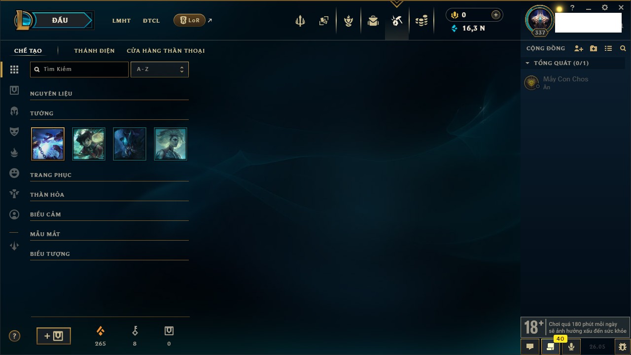 Rank Đơn: Chưa RankKhung: VàngTướng: 143 - Còn 16814 THXTrang Phục: 29Rank ĐTCL: Chưa RankLinh Thú: 91