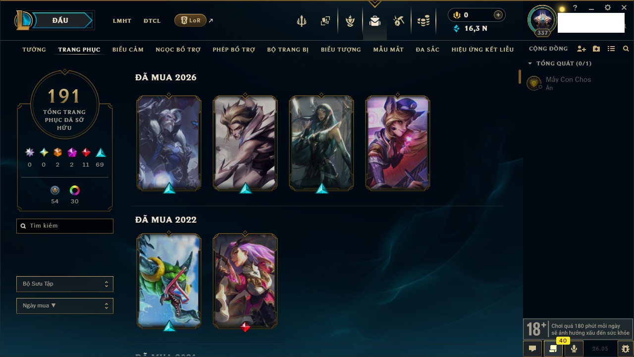 Rank Đơn: Chưa RankKhung: Chưa có khungTướng: 158 - Còn 1412 THXTrang Phục: 152Rank ĐTCL: Chưa RankLinh Thú: 69