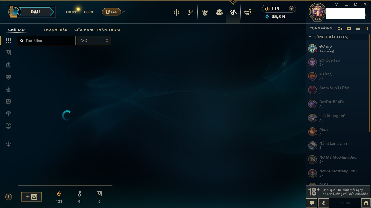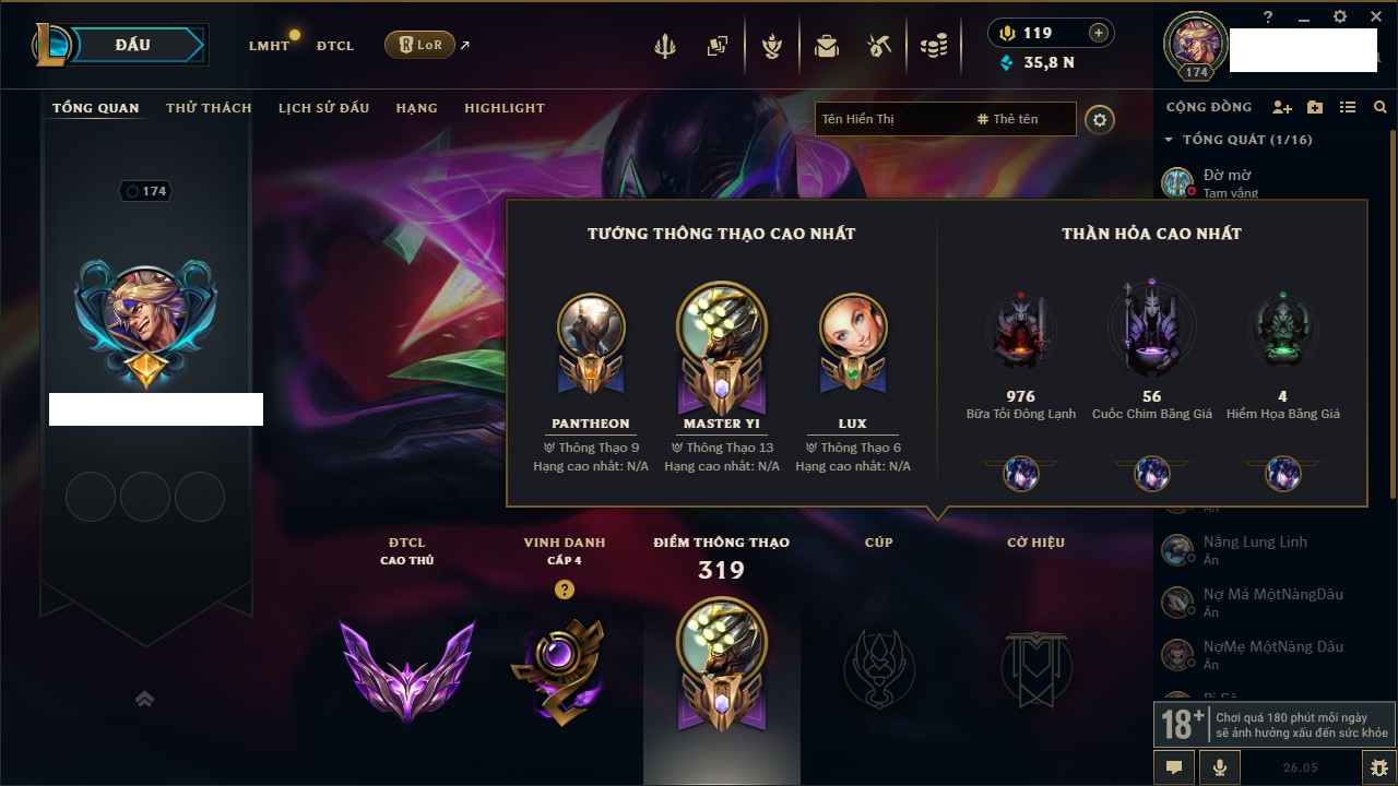Rank Đơn: Chưa RankKhung: Chưa có khungTướng: 170 - Còn 72514 THXTrang Phục: 202Rank ĐTCL: Chưa RankLinh Thú: 191