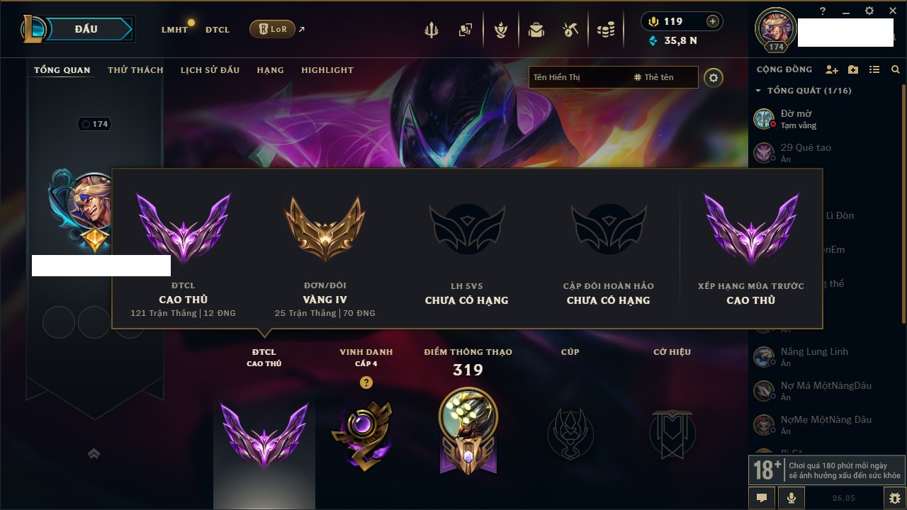Rank Đơn: Vàng IVKhung: BạcTướng: 171 - Còn 35874 THXTrang Phục: 172Rank ĐTCL: Rank Cao ThủLinh Thú: 261