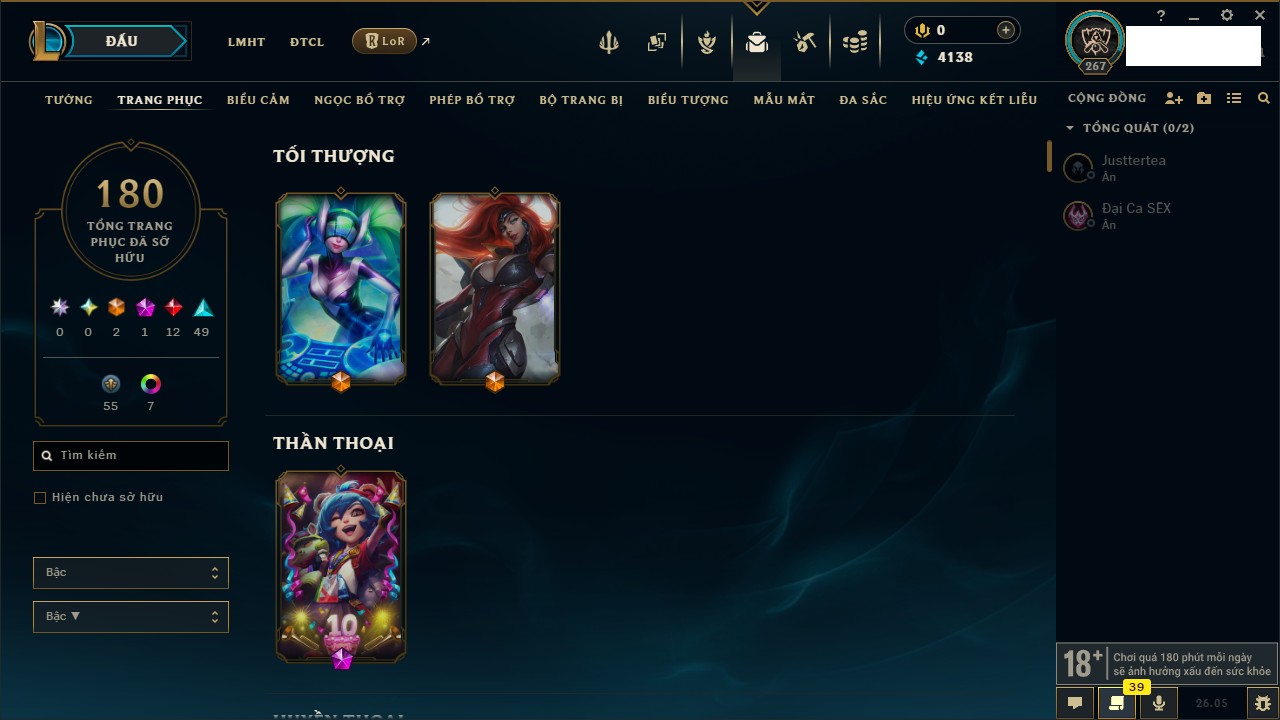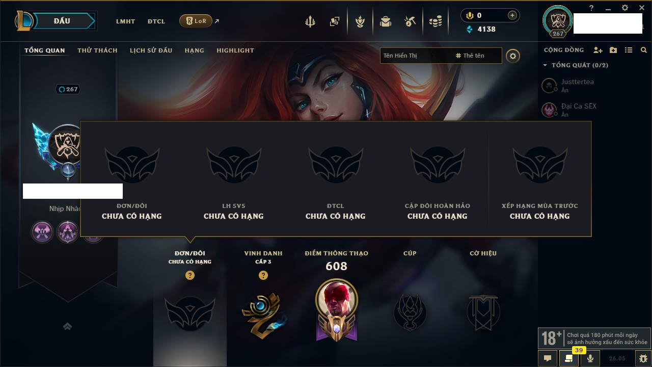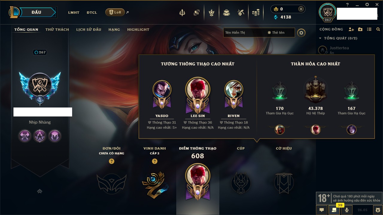 Rank Đơn: Chưa RankKhung: Chưa có khungTướng: 162 - Còn 4138 THXTrang Phục: 180Rank ĐTCL: Chưa RankLinh Thú: 29
